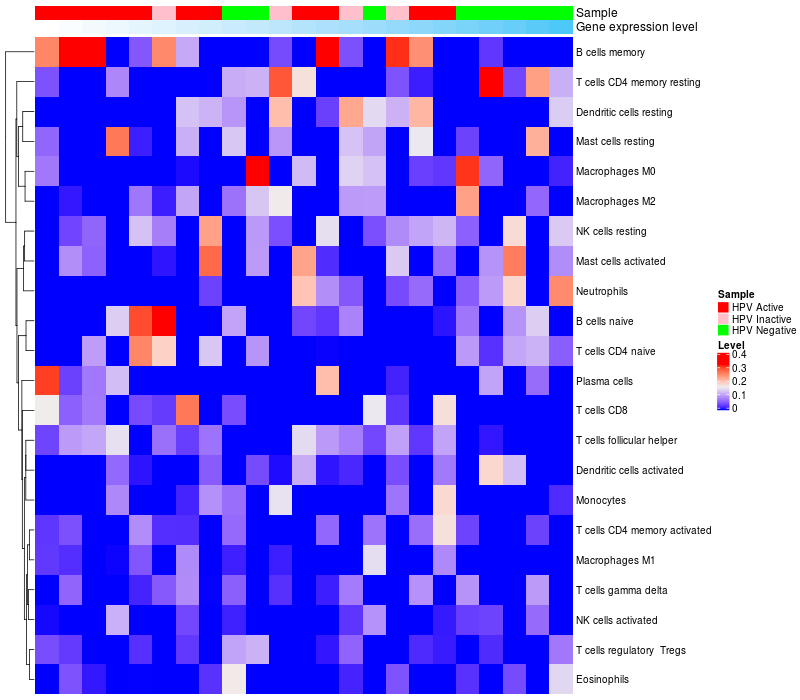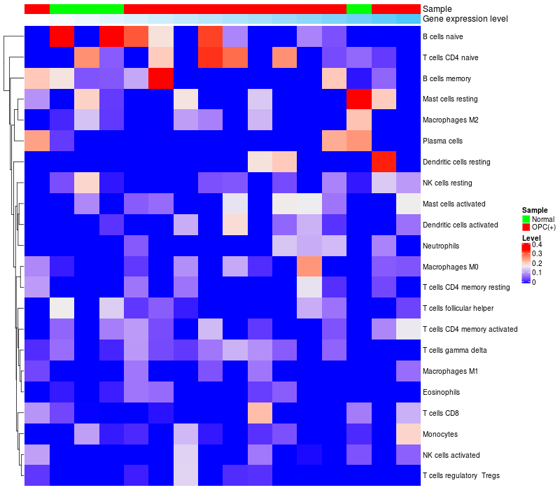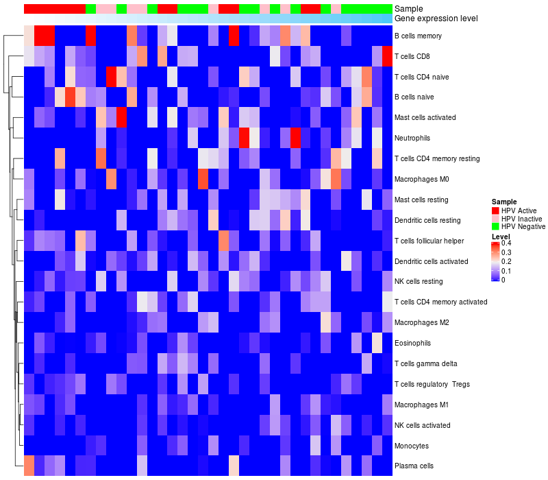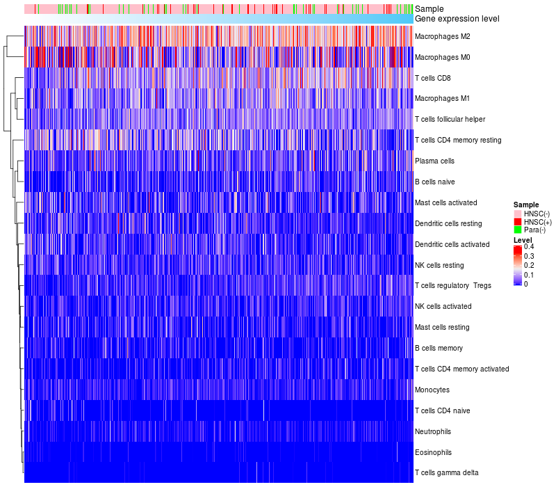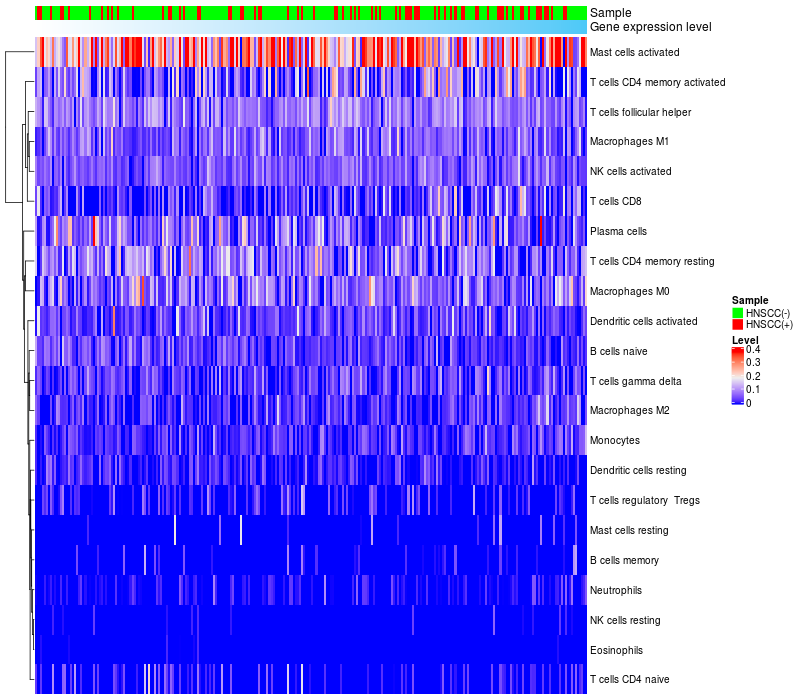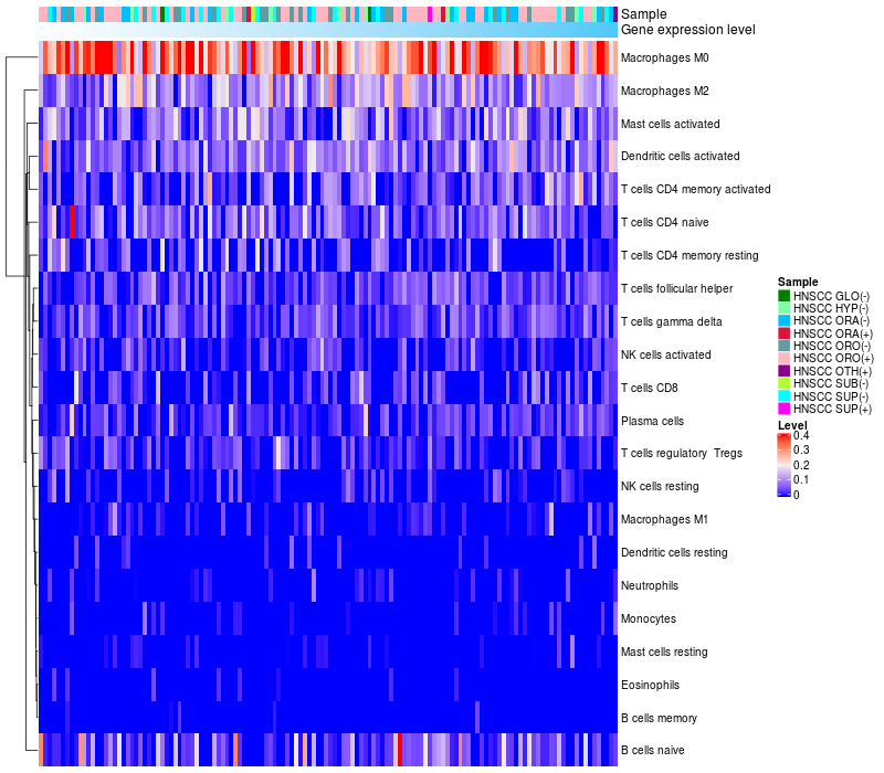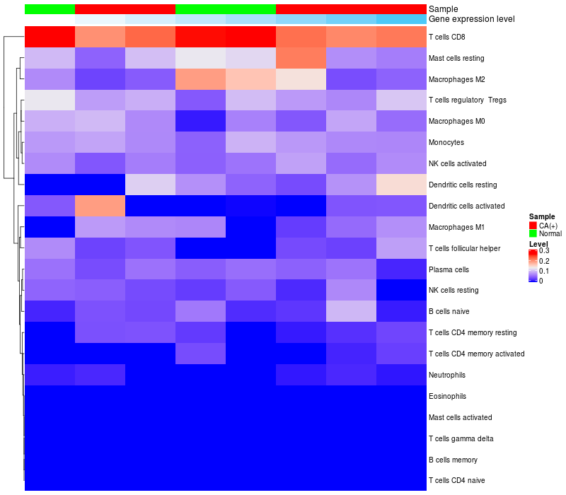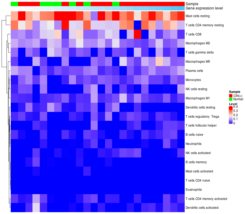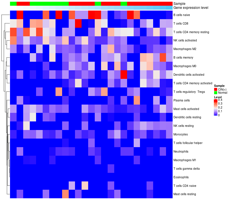 • Left: Heatmap of target gene expression and the level of various types of immune cells (cell type fractions) in all samples based on CIBERSORT method.