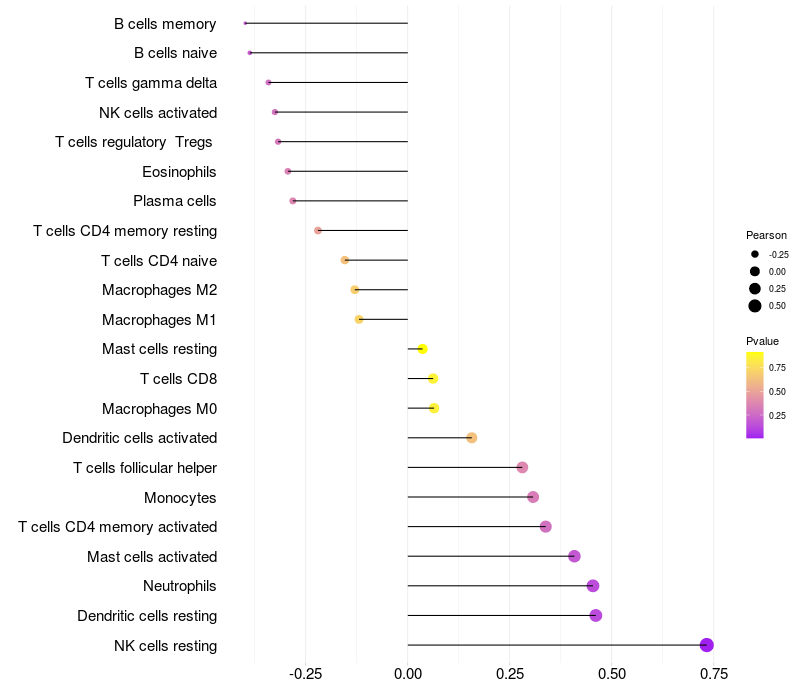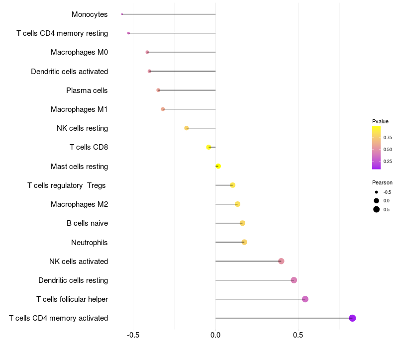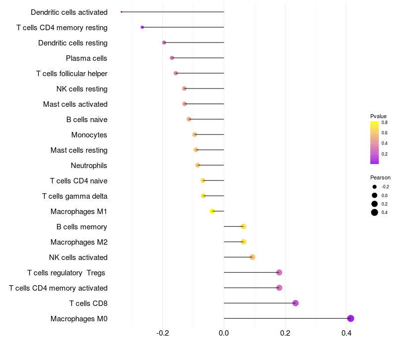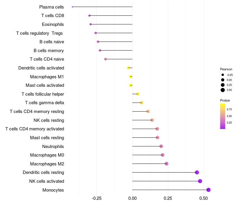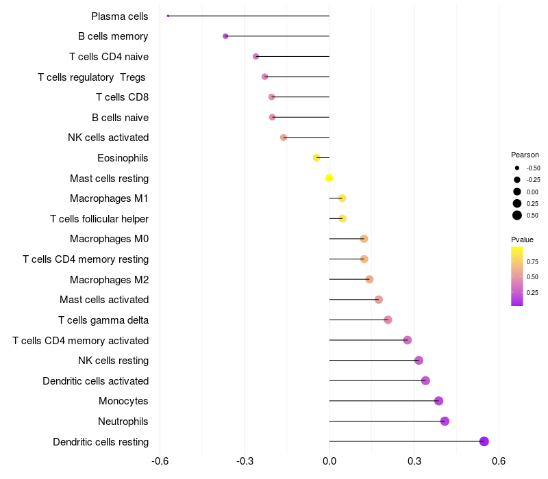 HeatMap of cell type fractions in all samples Lollipop of VMO1 expression and immune infiltrating cell level correlation result in HPV+ samples