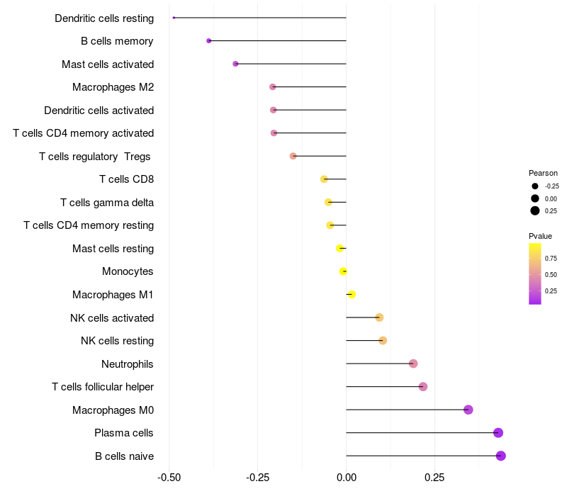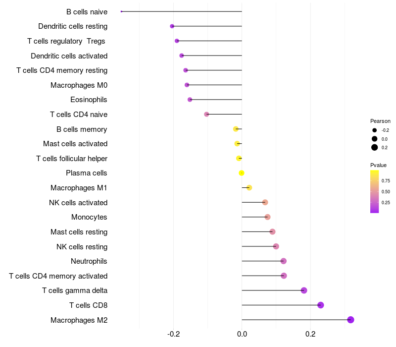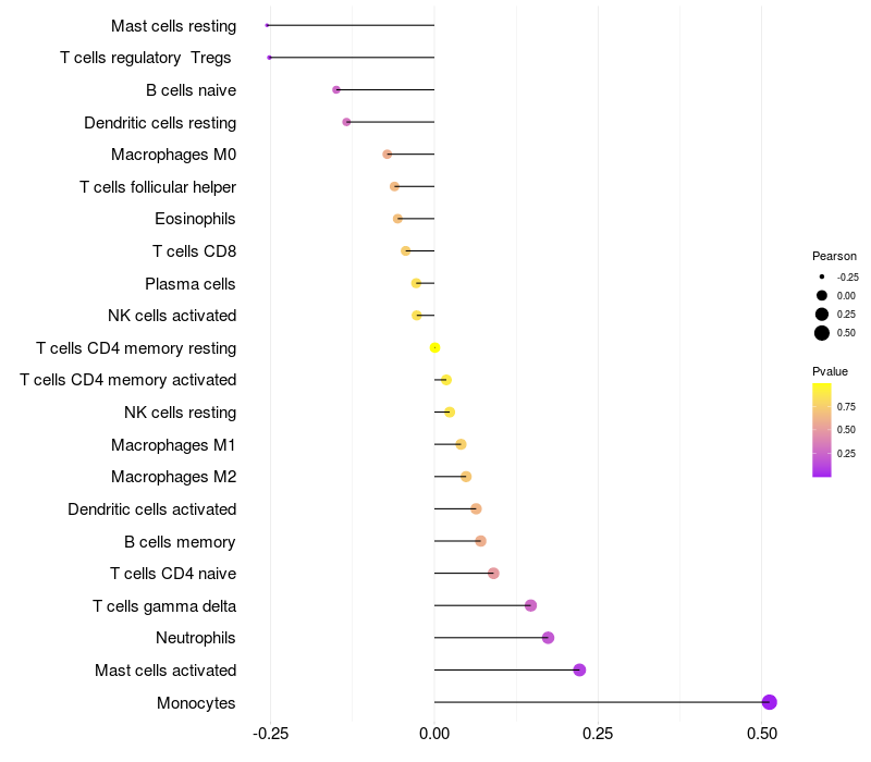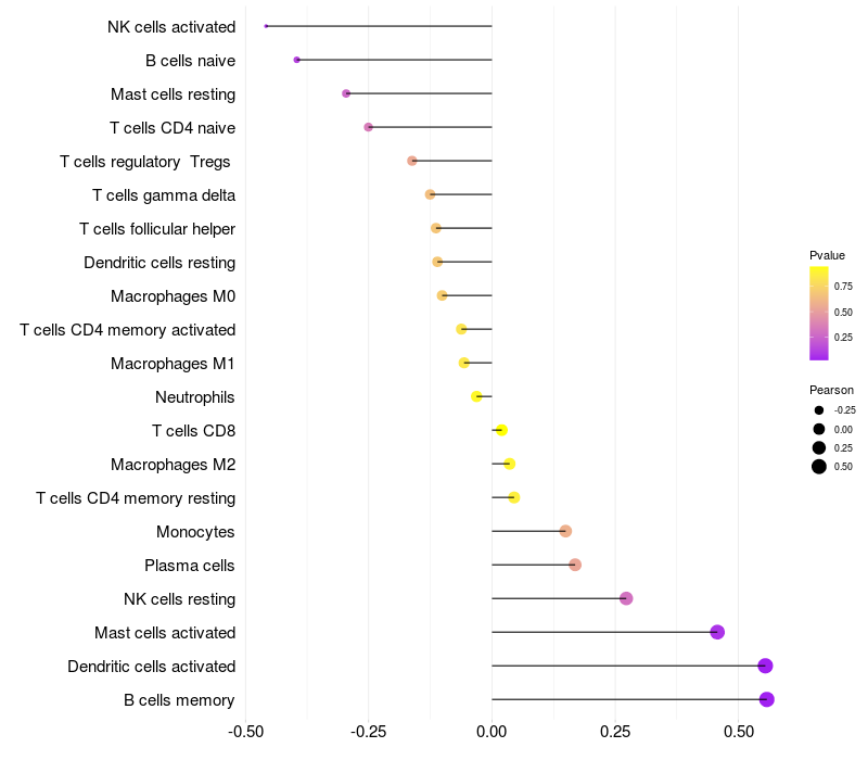 • Right: Correlation of target gene expression and the level of various types of immune cells in virus positive samples (Pearson Correlation Coefficient).