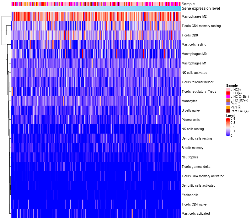 Liver hepatocellular carcinoma HCV (HBV+)(86), Liver hepatocellular carcinoma HCV (HBV-)(19), Liver hepatocellular carcinoma (HBV+)(209), Liver hepatocellular carcinoma (HBV+)(60), Paracancerous HCV (HBV+)(4), Paracancerous (HBV-)(28), Paracancerous (HBV+)(18) |