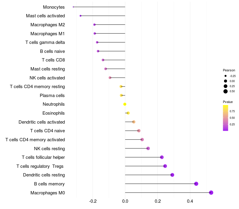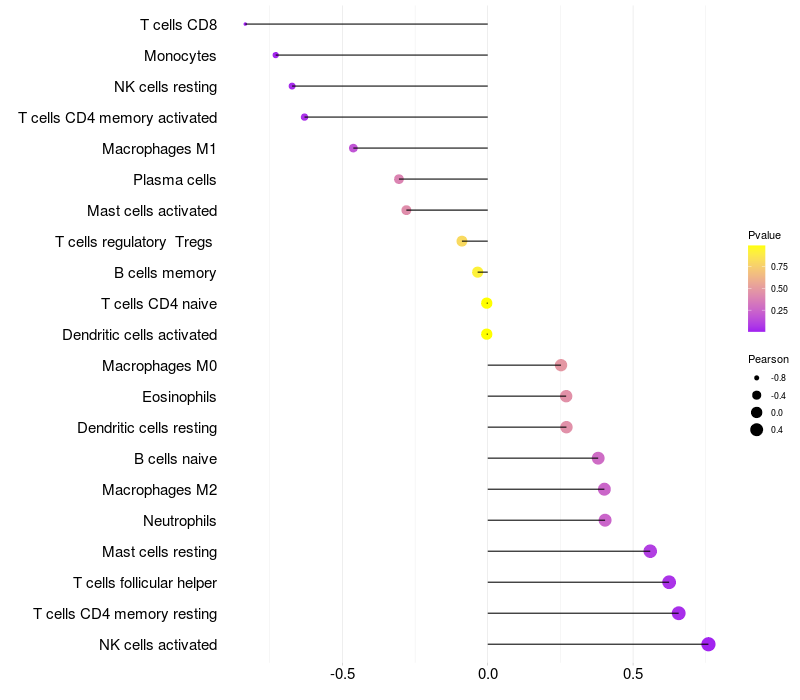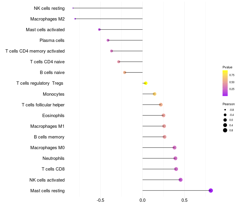 Lollipop of VPS72 expression and immune infiltrating cell level correlation result in HBV+ Liver cirrhosis samples