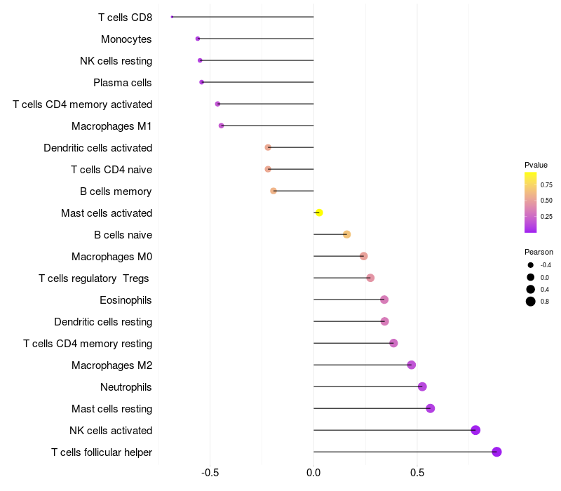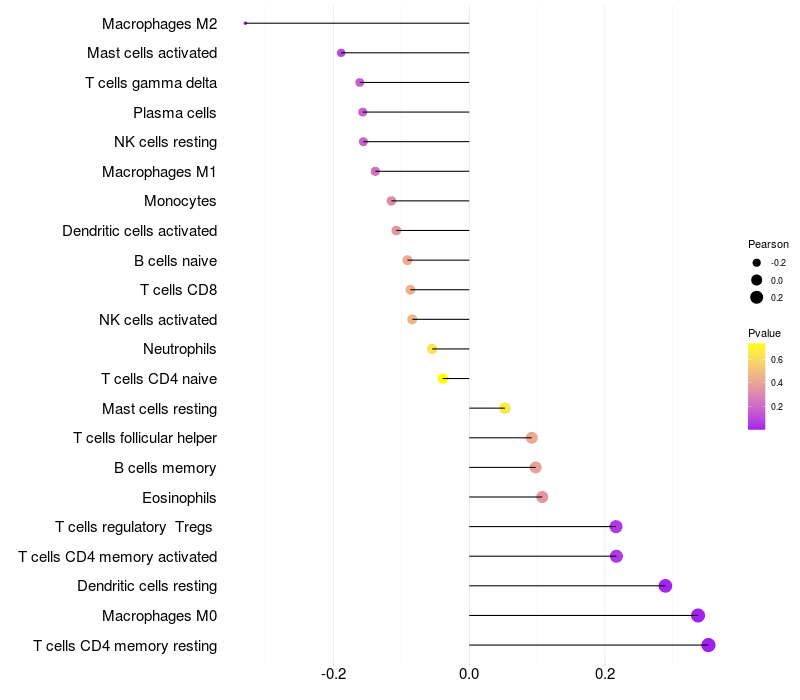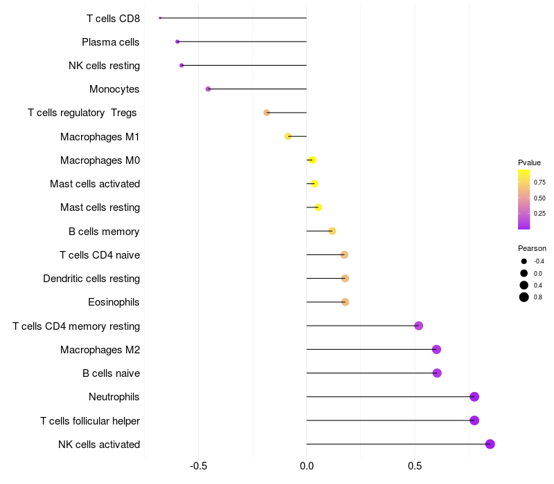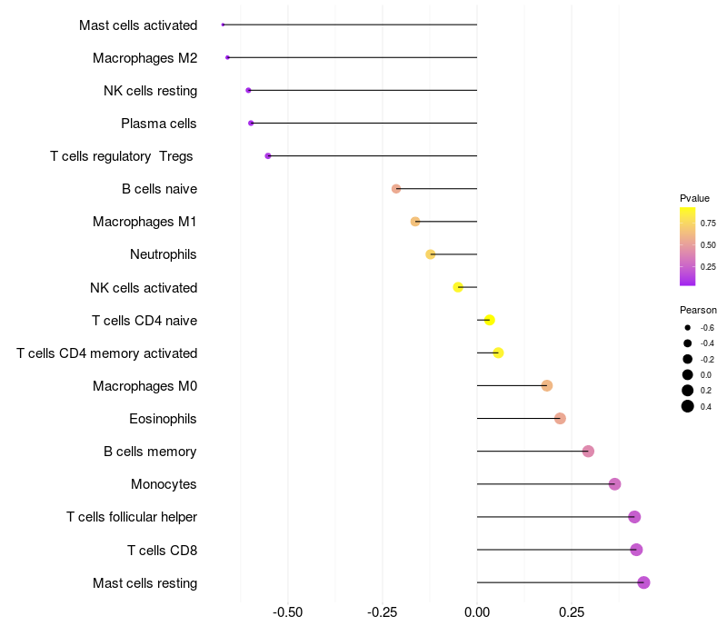 Lollipop of VRK1 expression and immune infiltrating cell level correlation result in HBV+ samples