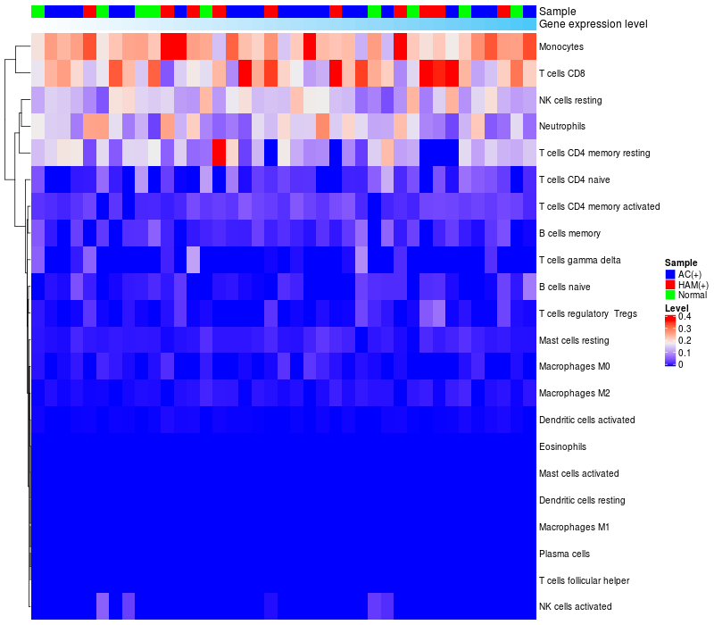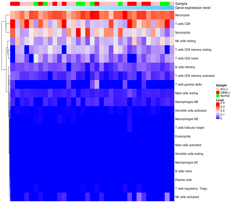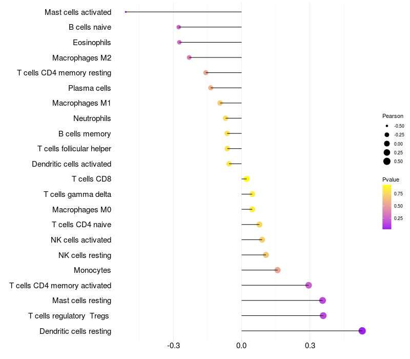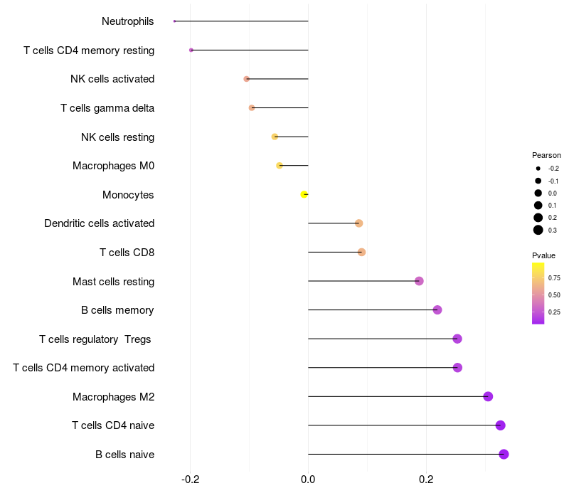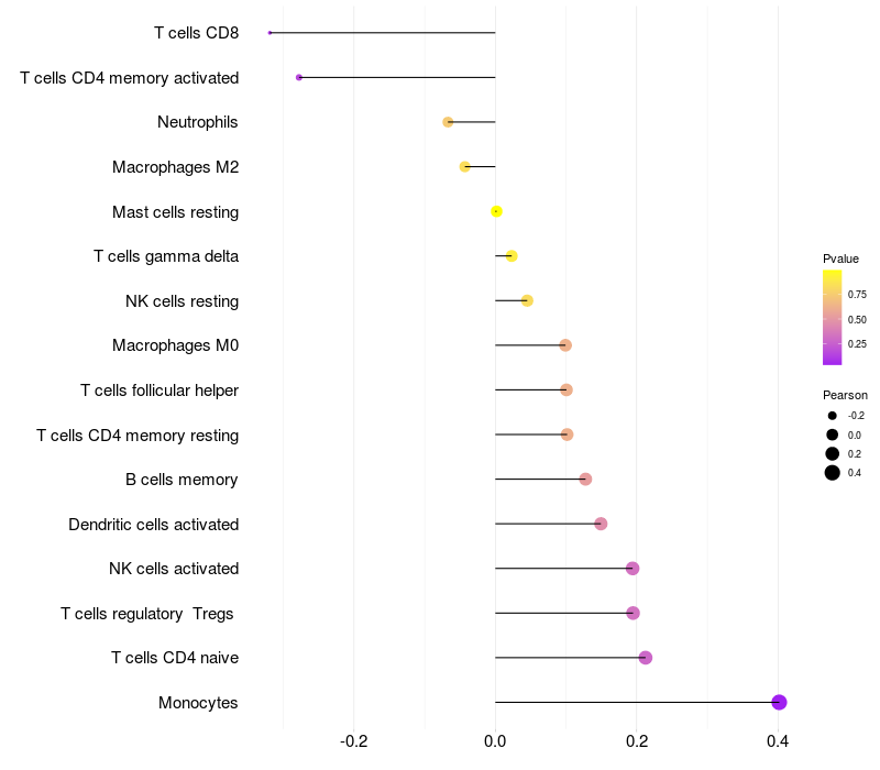 Lollipop of VSNL1 expression and immune infiltrating cell level correlation result in HTLV1+ samples