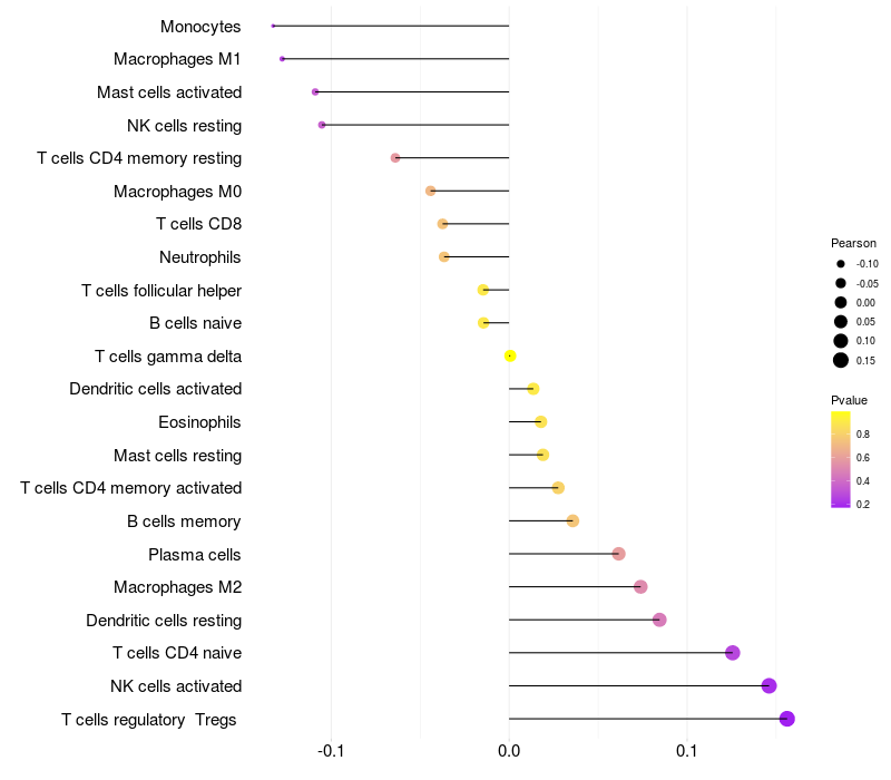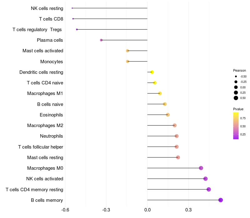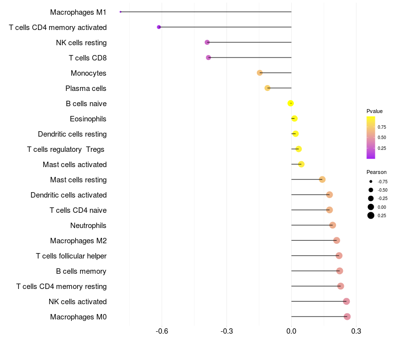 Lollipop of VTI1A expression and immune infiltrating cell level correlation result in HBV+ Chronic HBV (CHB) infection samples