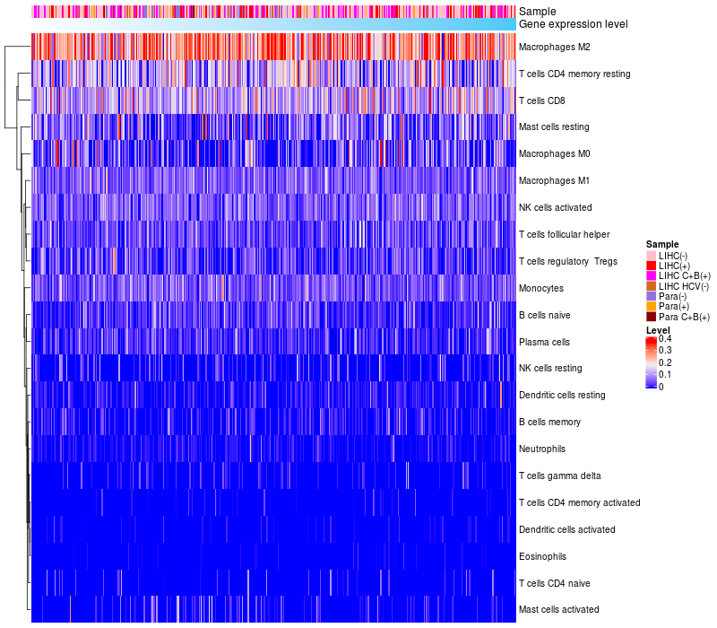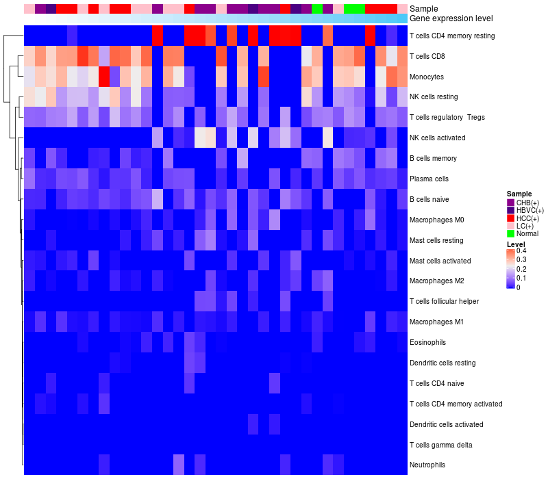 Liver hepatocellular carcinoma HCV (HBV+)(86), Liver hepatocellular carcinoma HCV (HBV-)(19), Liver hepatocellular carcinoma (HBV+)(209), Liver hepatocellular carcinoma (HBV+)(60), Paracancerous HCV (HBV+)(4), Paracancerous (HBV-)(28), Paracancerous (HBV+)(18) |