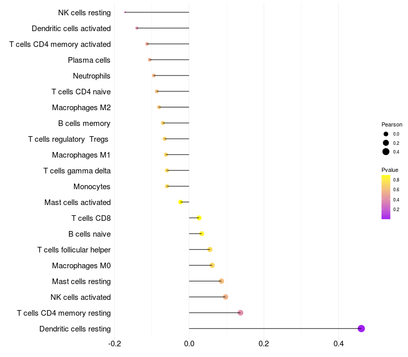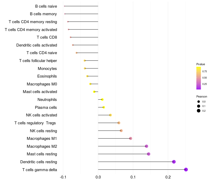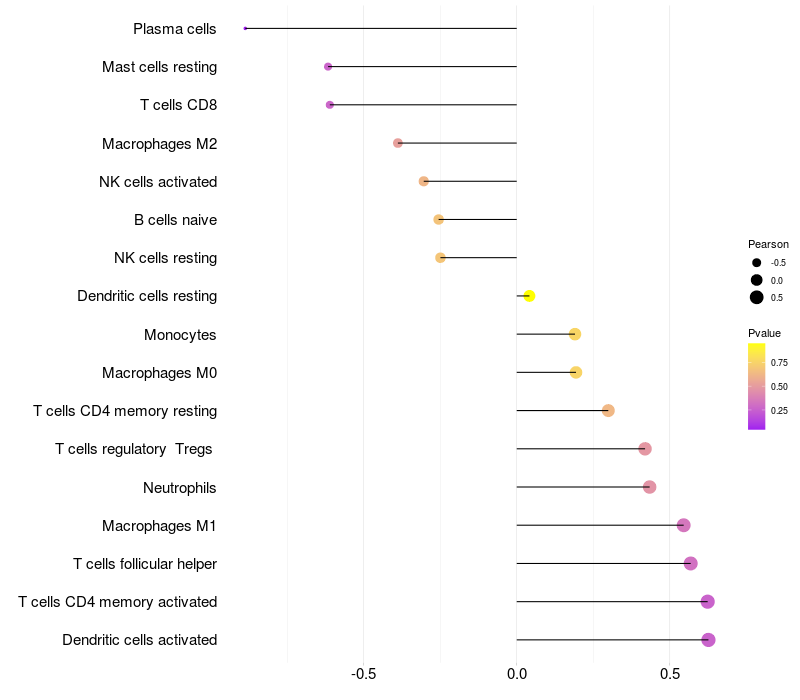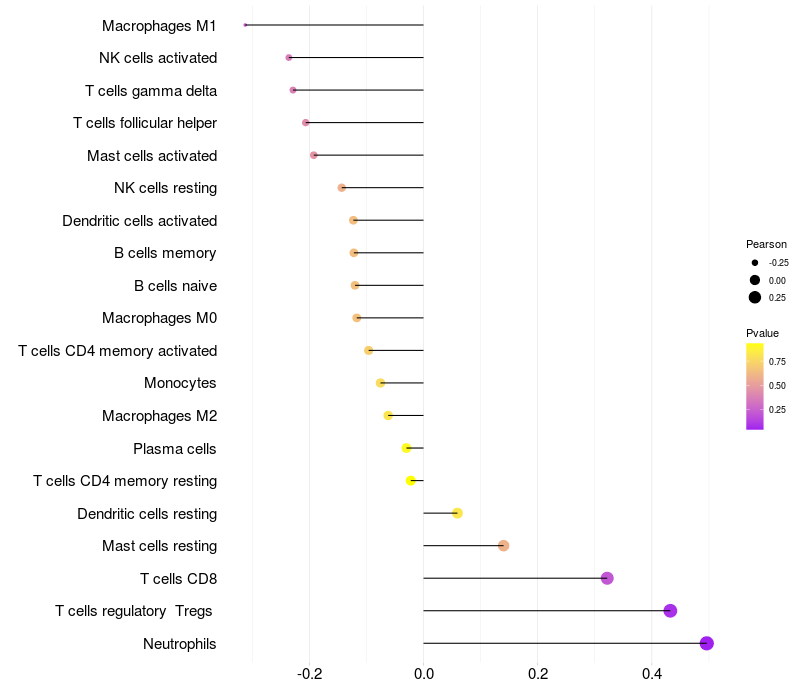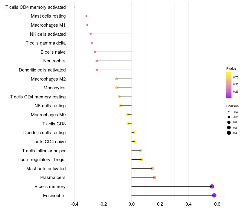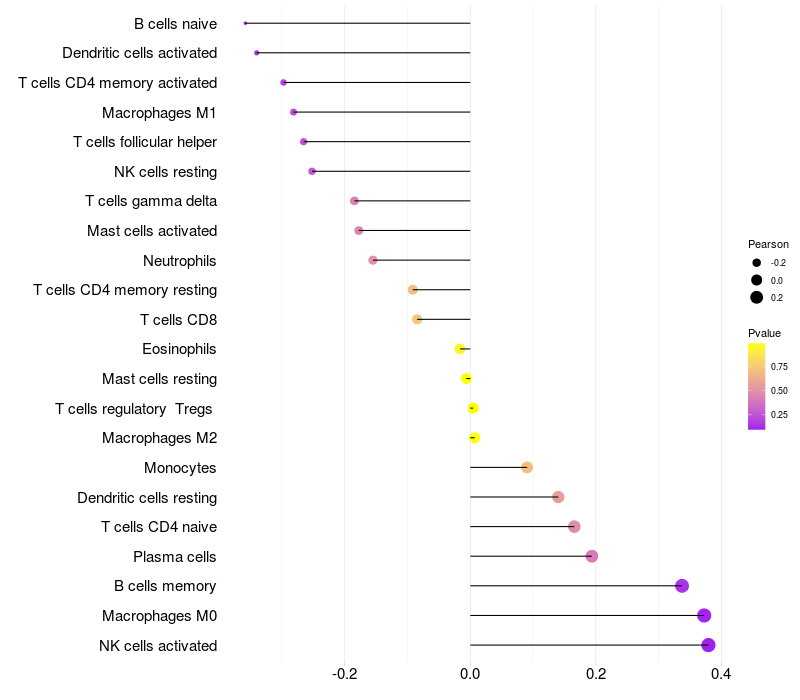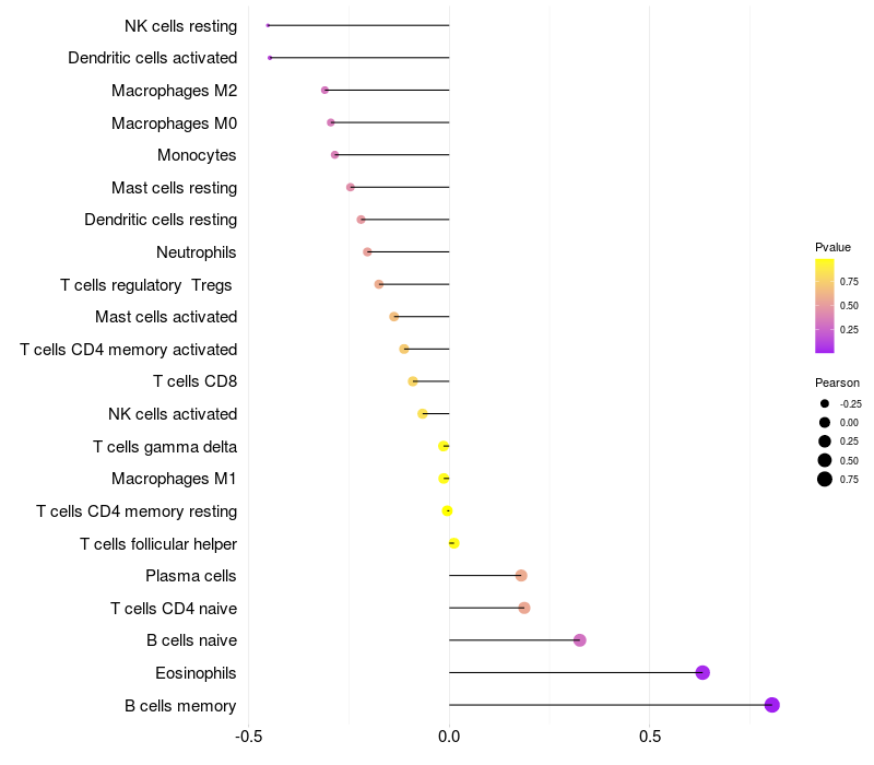 Lollipop of VWC2 expression and immune infiltrating cell level correlation result in HPV+ samples