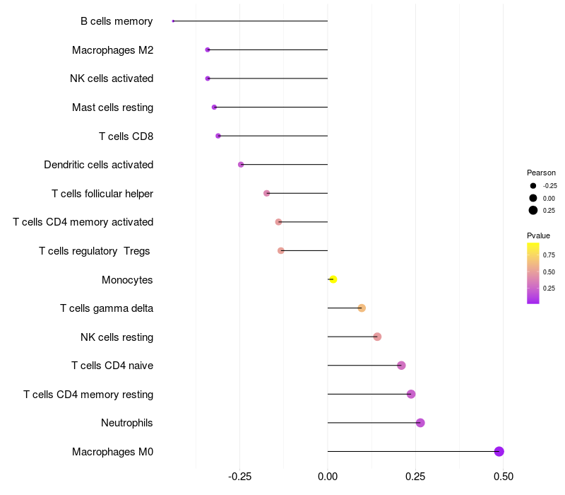 Lollipop of VWF expression and immune infiltrating cell level correlation result in HTLV1+ samples