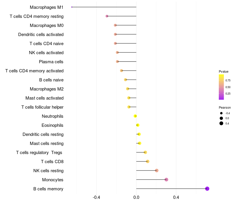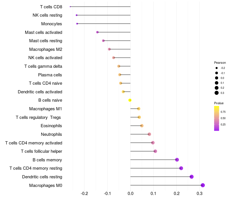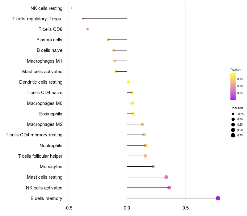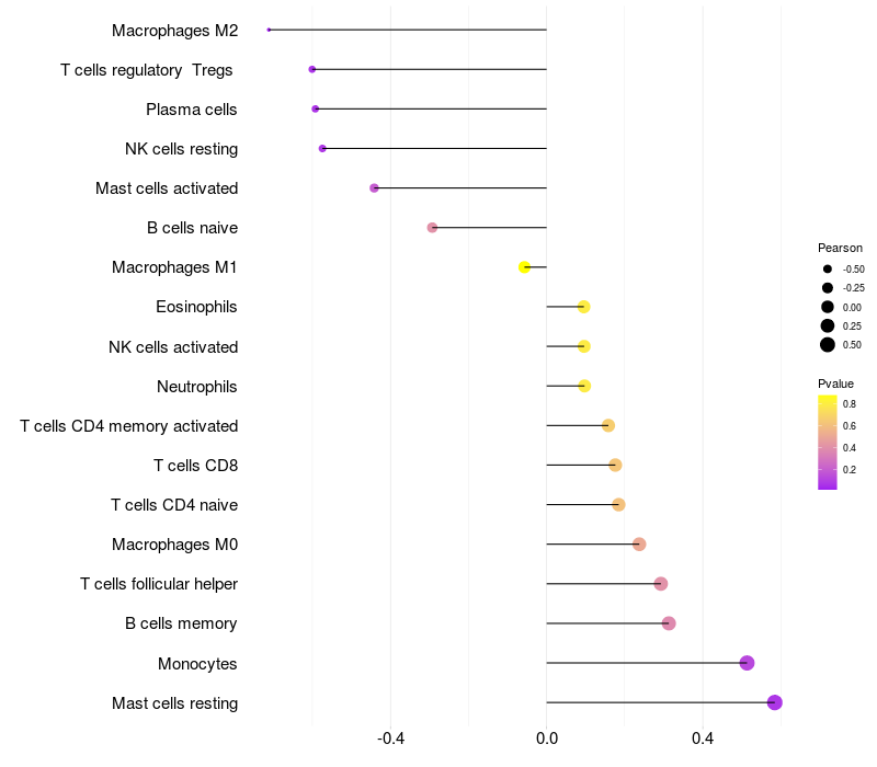 Lollipop of WAC expression and immune infiltrating cell level correlation result in HBV+ Liver cirrhosis samples