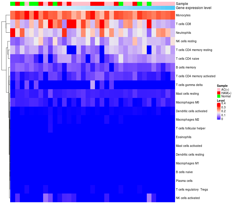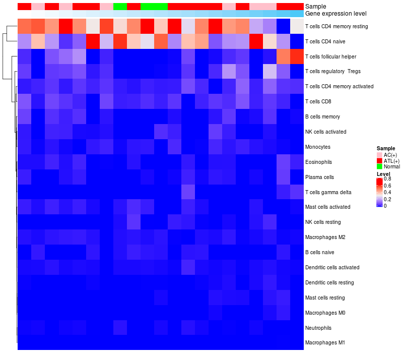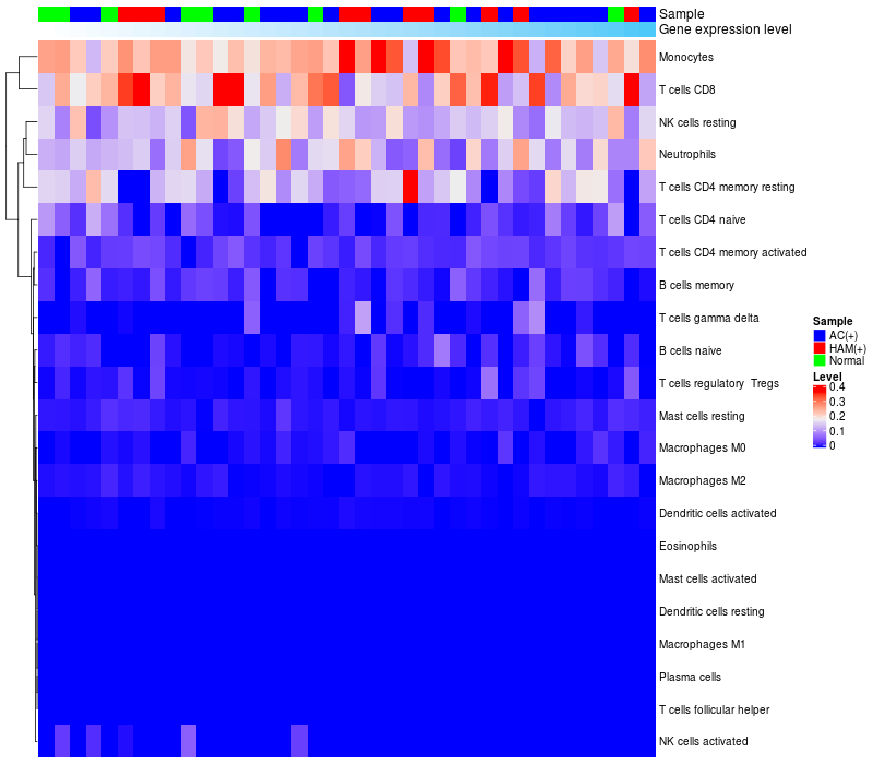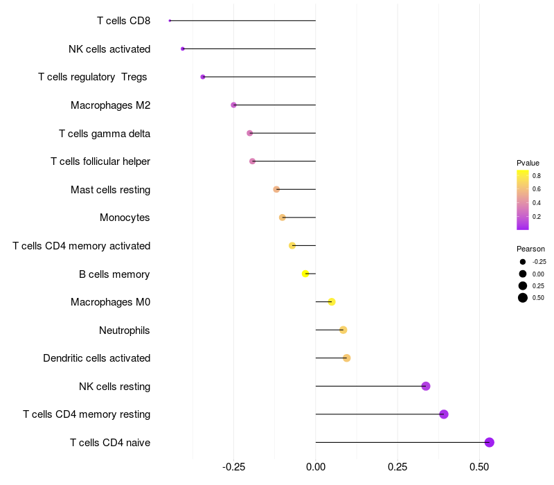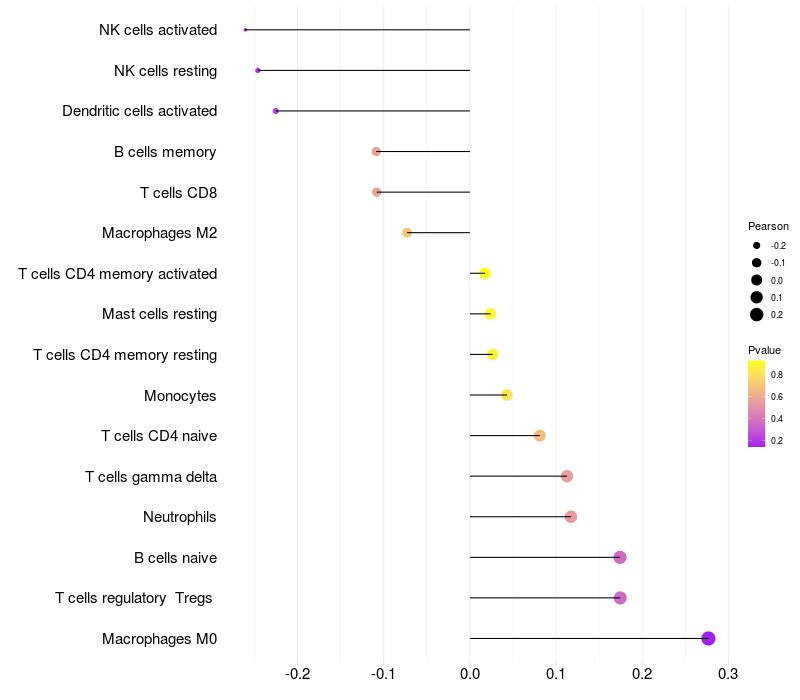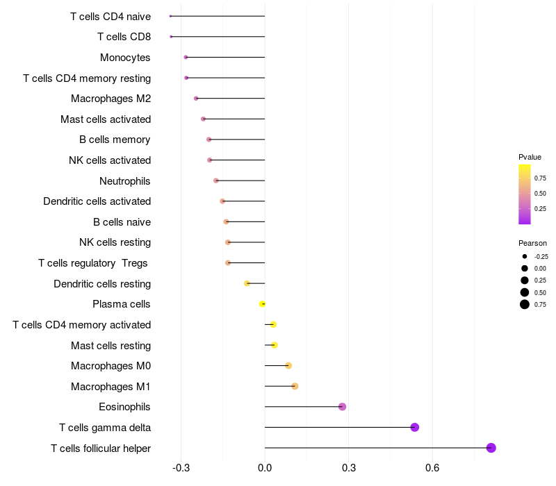 Lollipop of WASF3 expression and immune infiltrating cell level correlation result in HTLV1+ samples