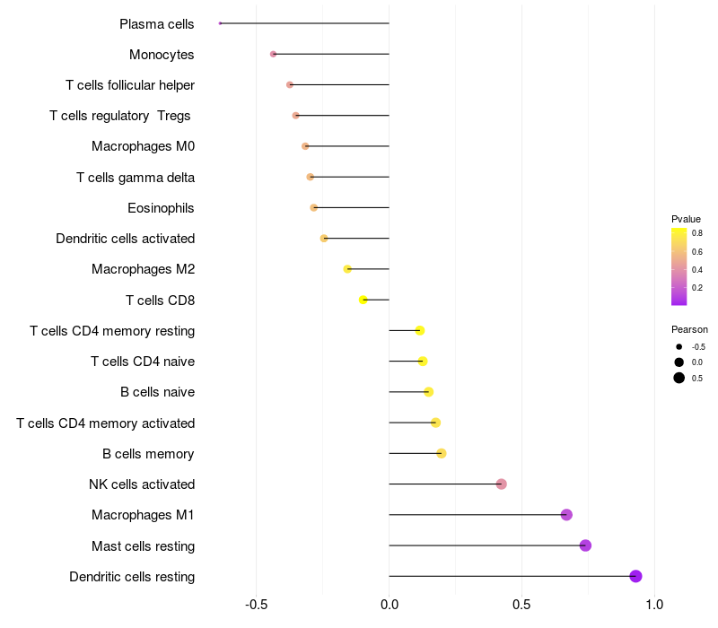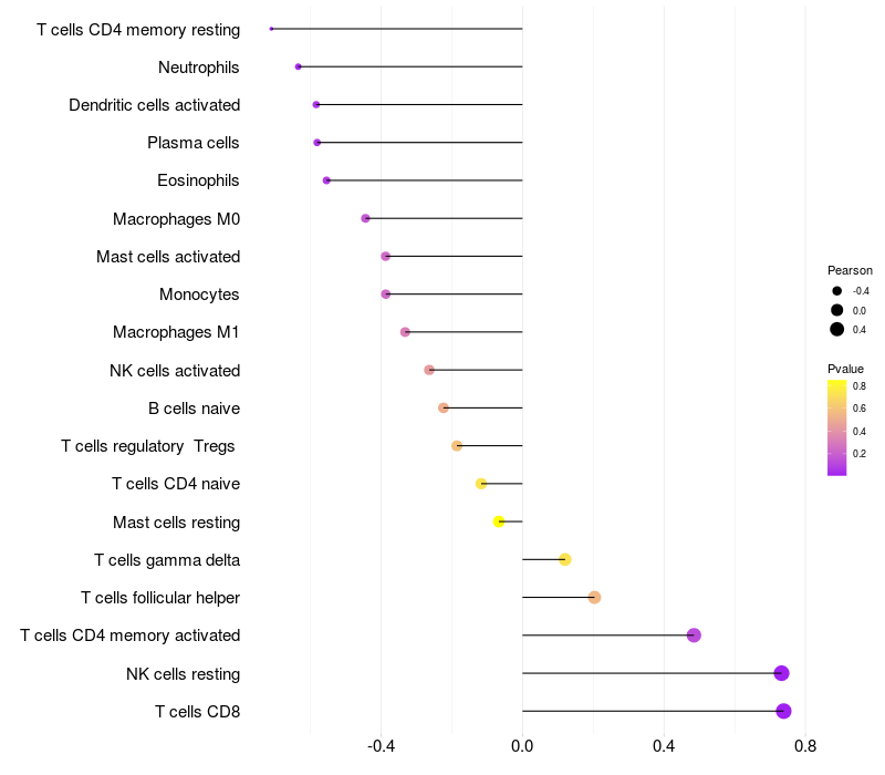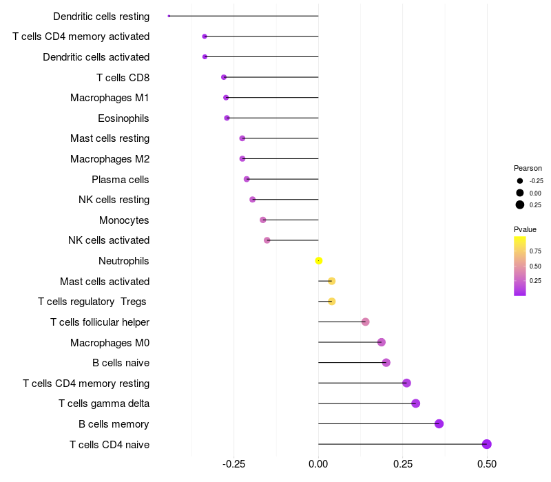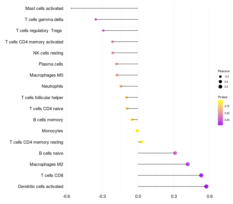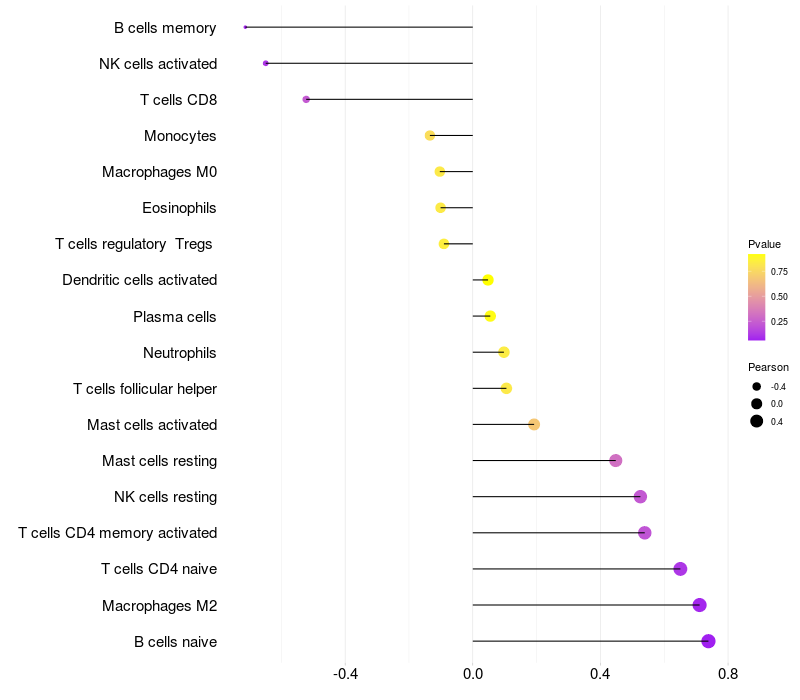 Lollipop of WBP1L expression and immune infiltrating cell level correlation result in EBV+ samples