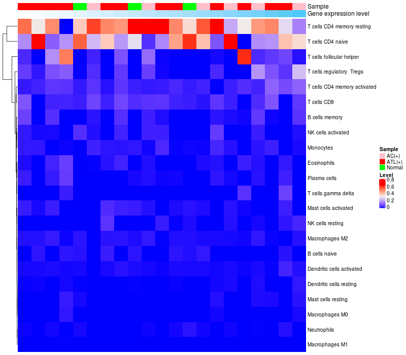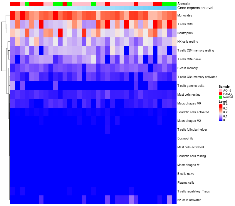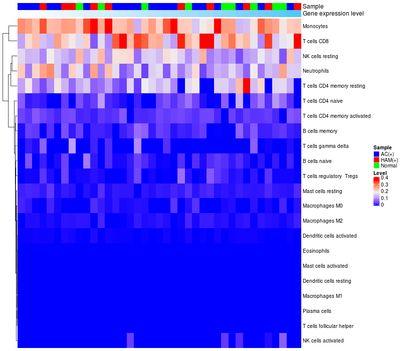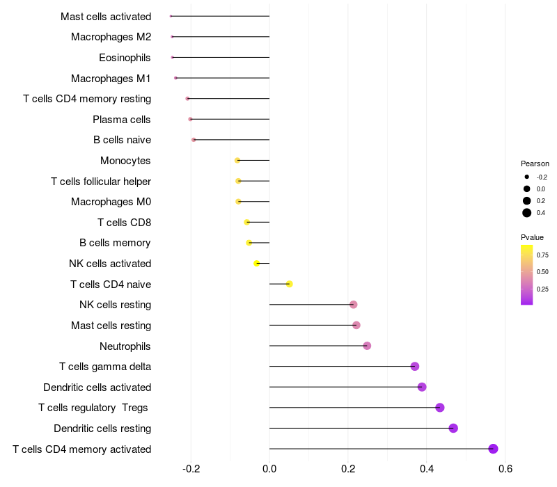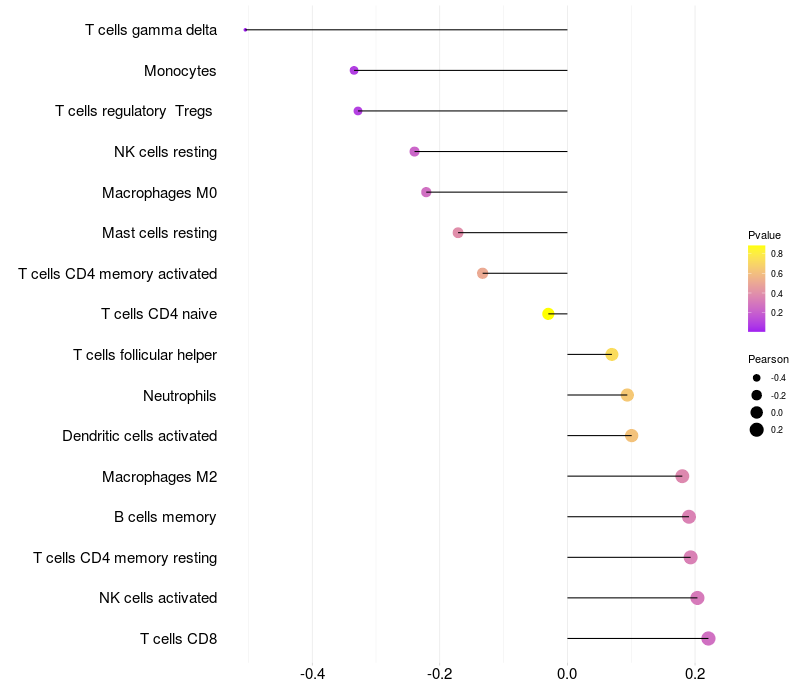 Lollipop of WDR53 expression and immune infiltrating cell level correlation result in HTLV1+ samples
