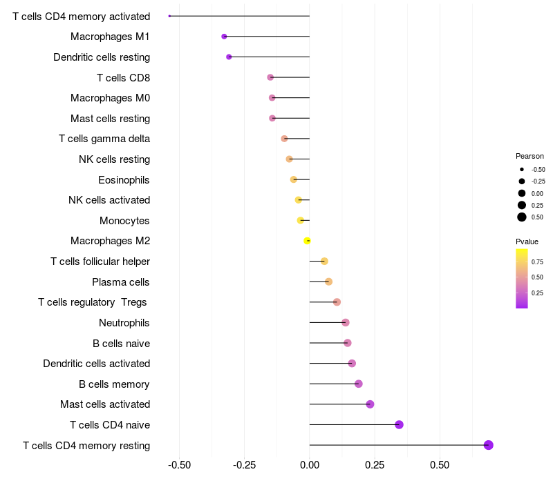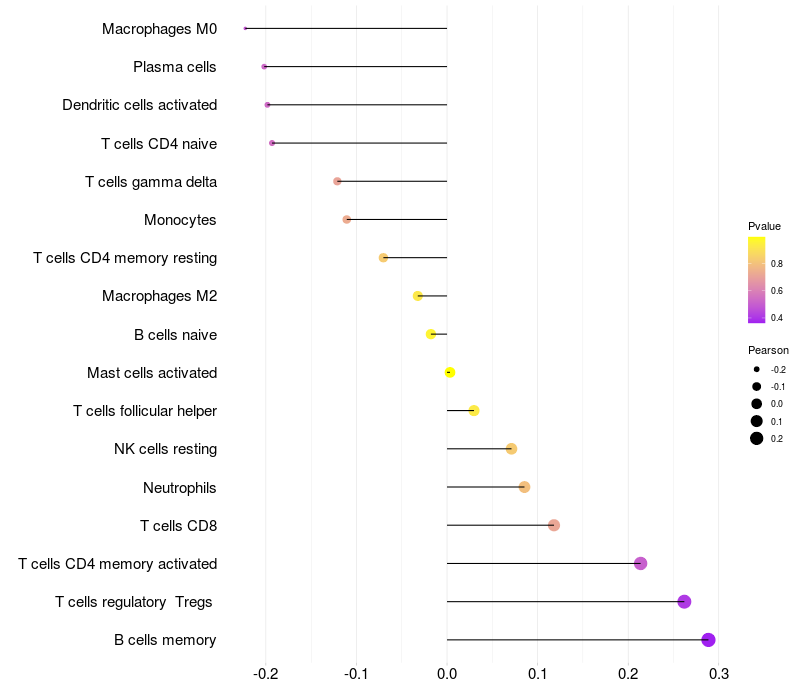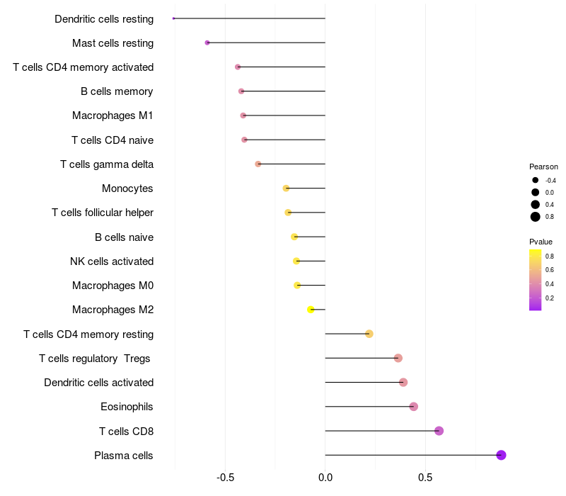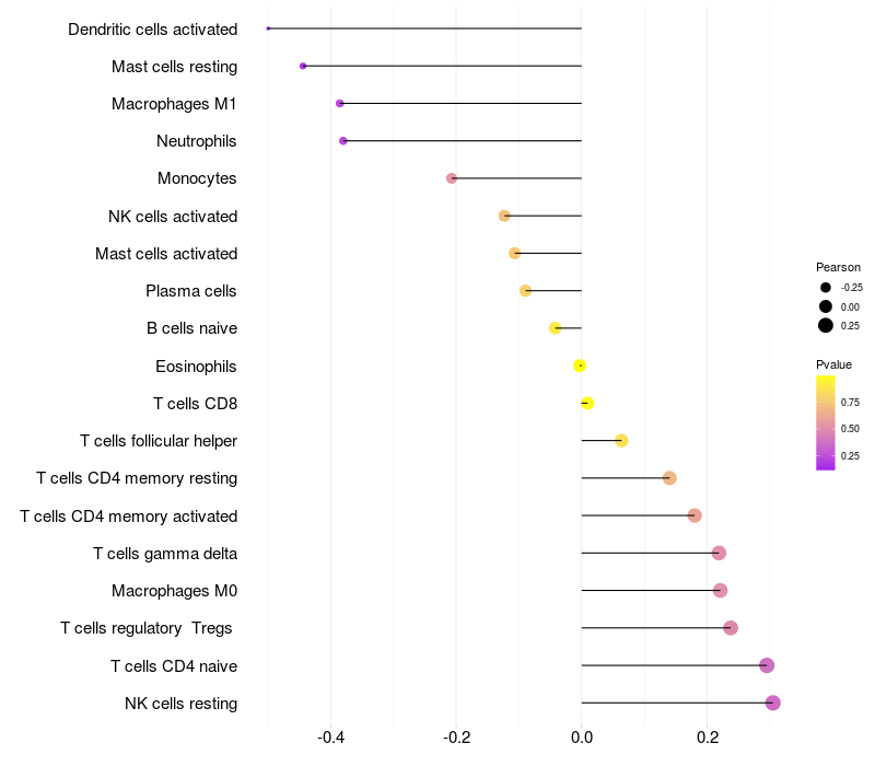 Lollipop of WEE2-AS1 expression and immune infiltrating cell level correlation result in EBV+ samples