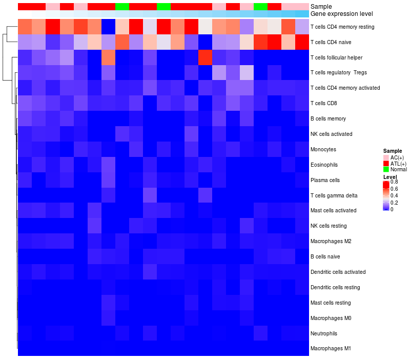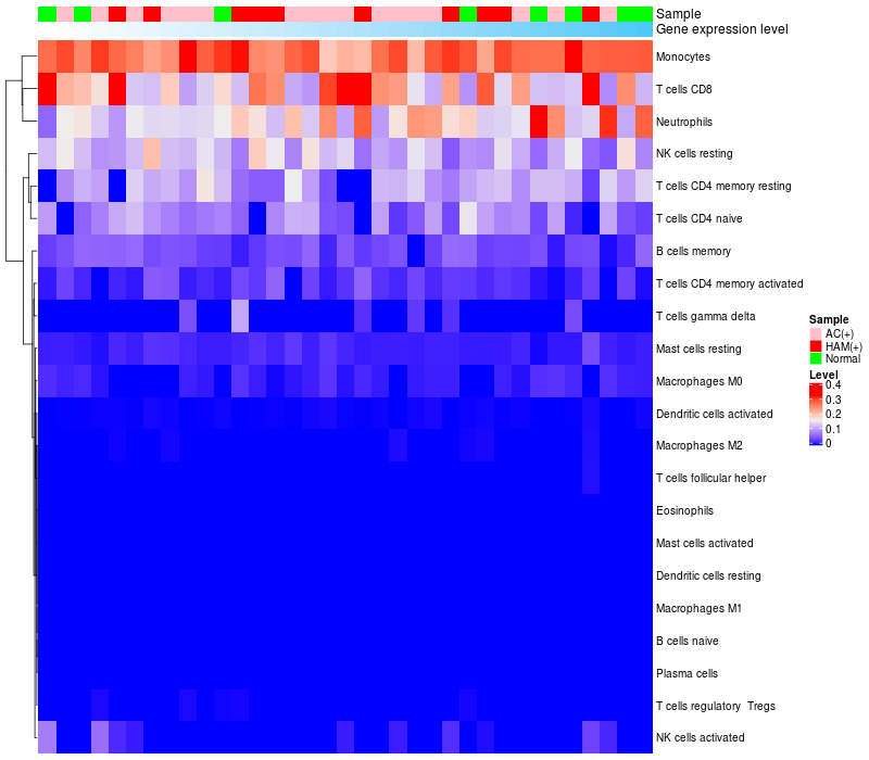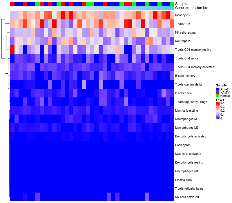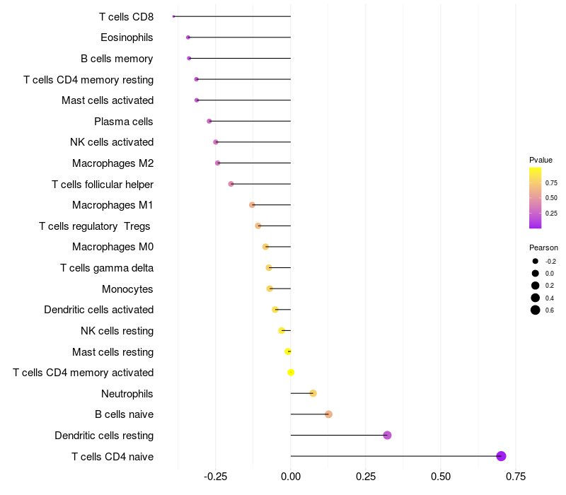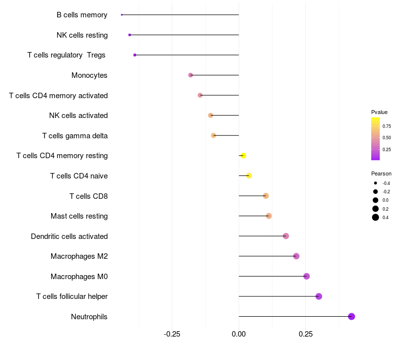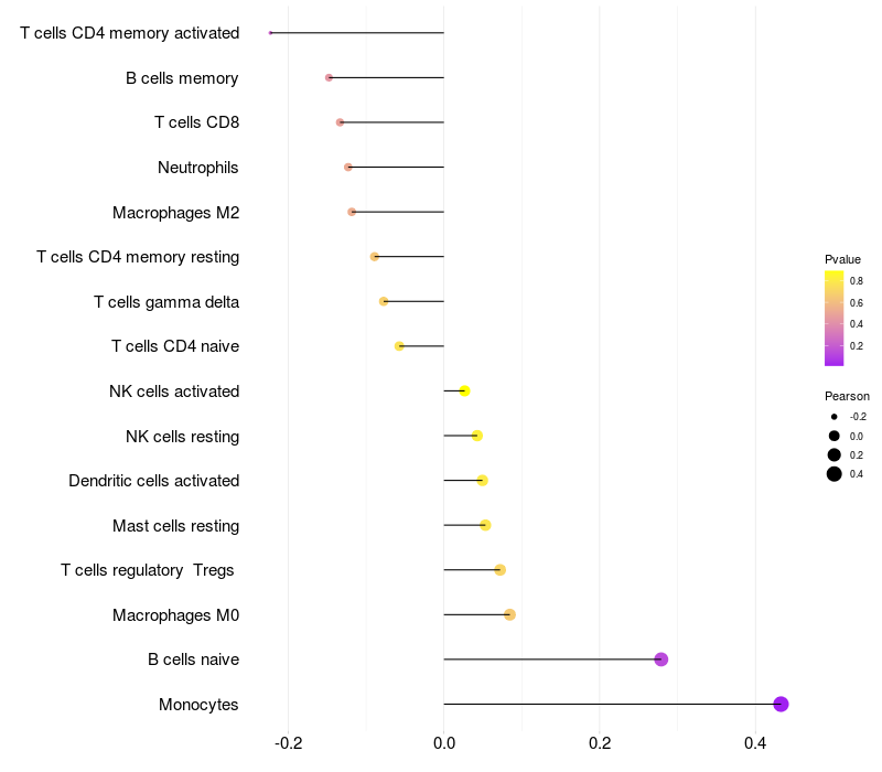 Lollipop of WWC2 expression and immune infiltrating cell level correlation result in HTLV1+ samples