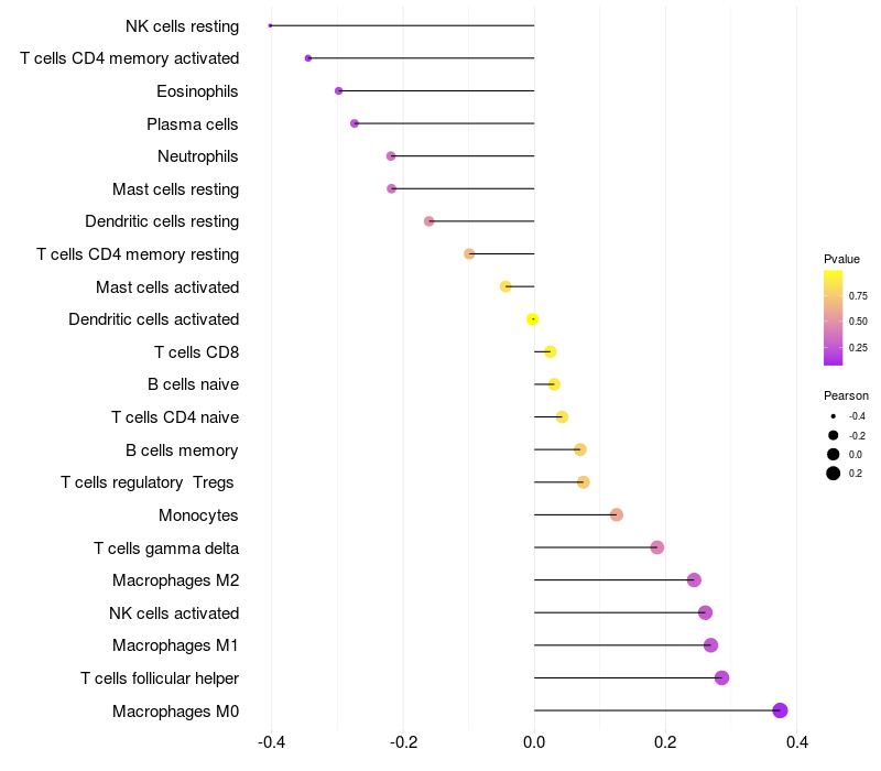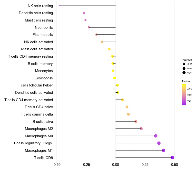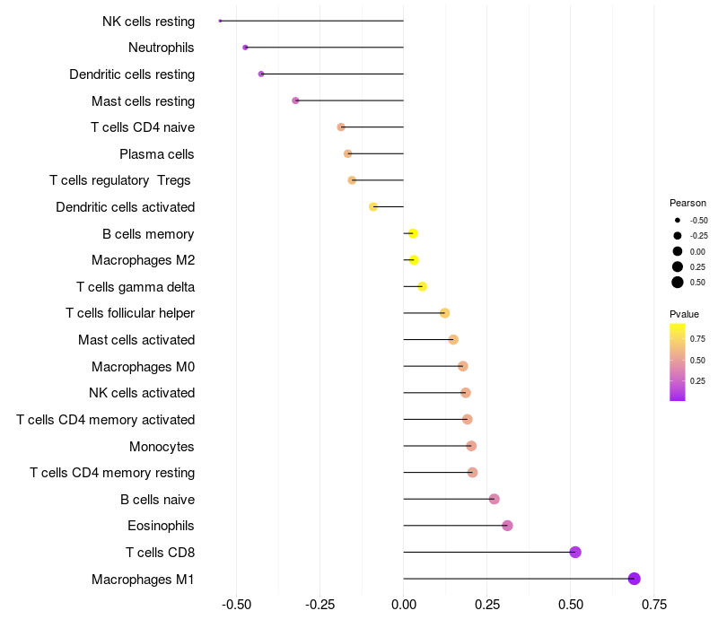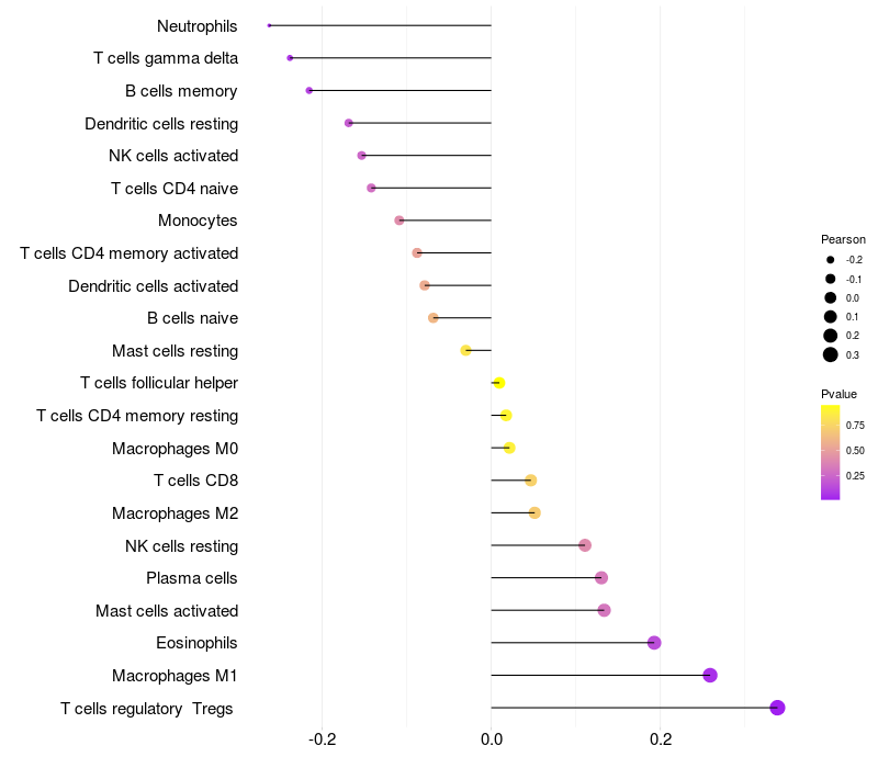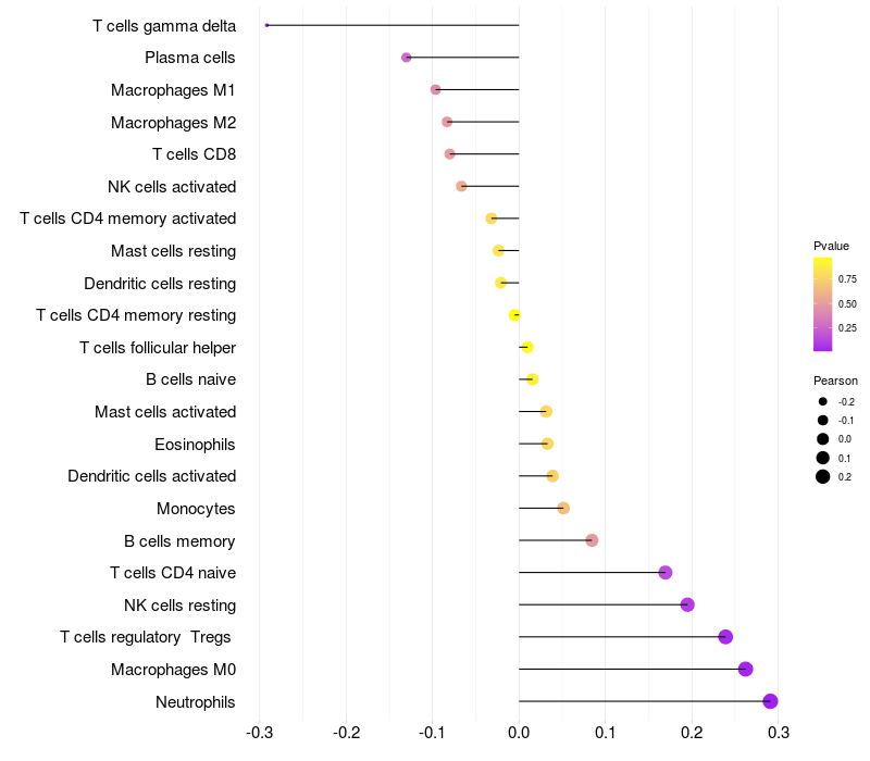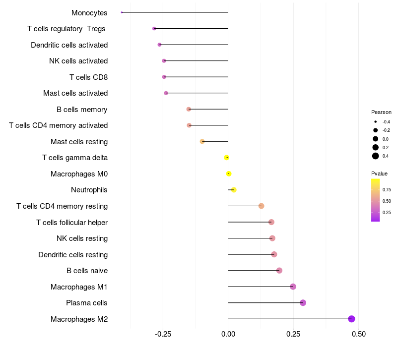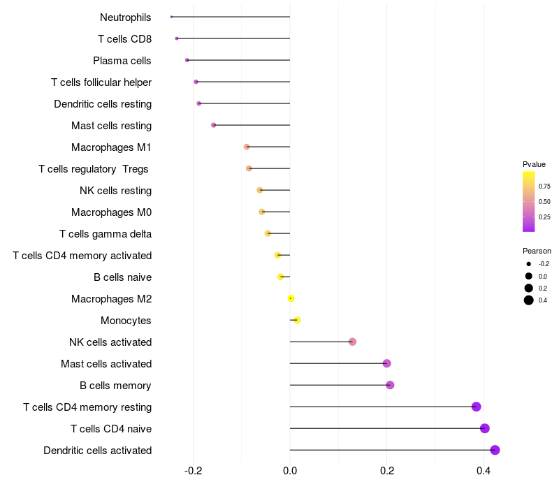 Lollipop of WWC3 expression and immune infiltrating cell level correlation result in HPV+ samples