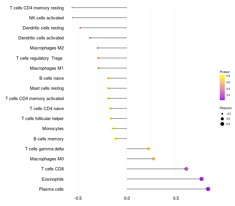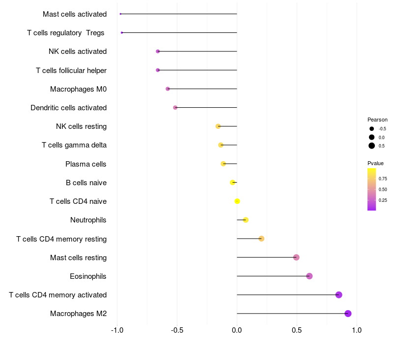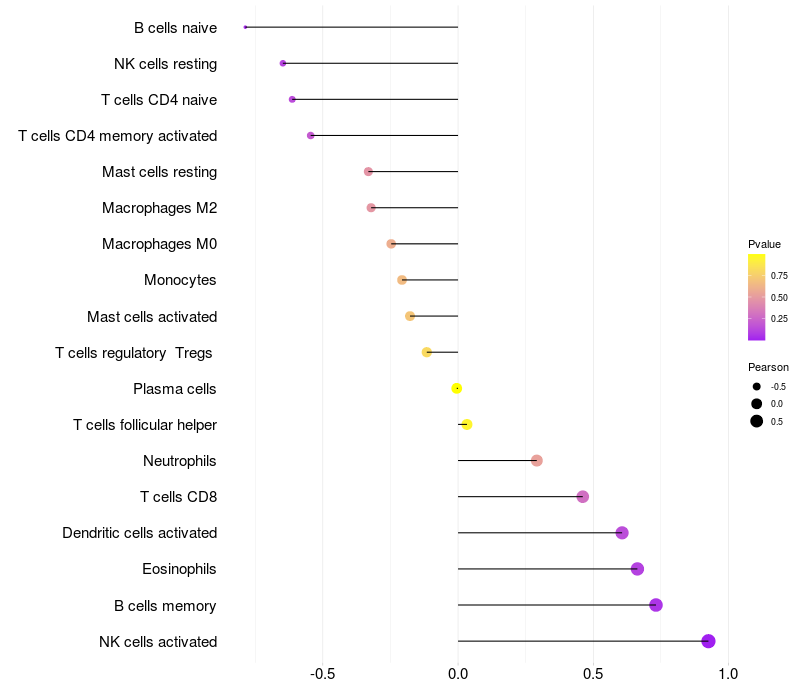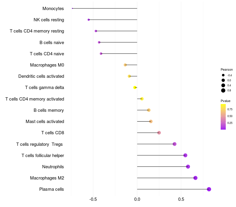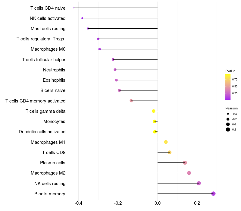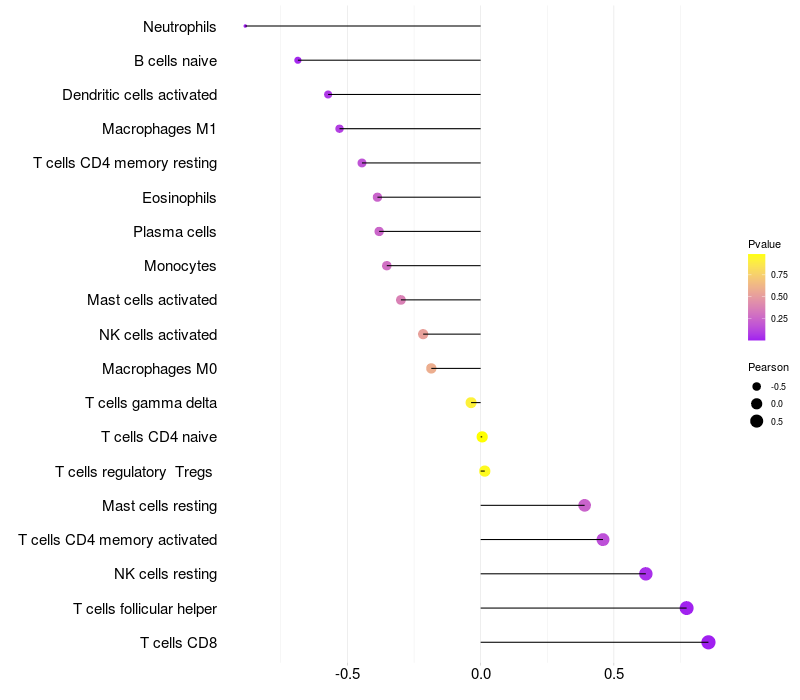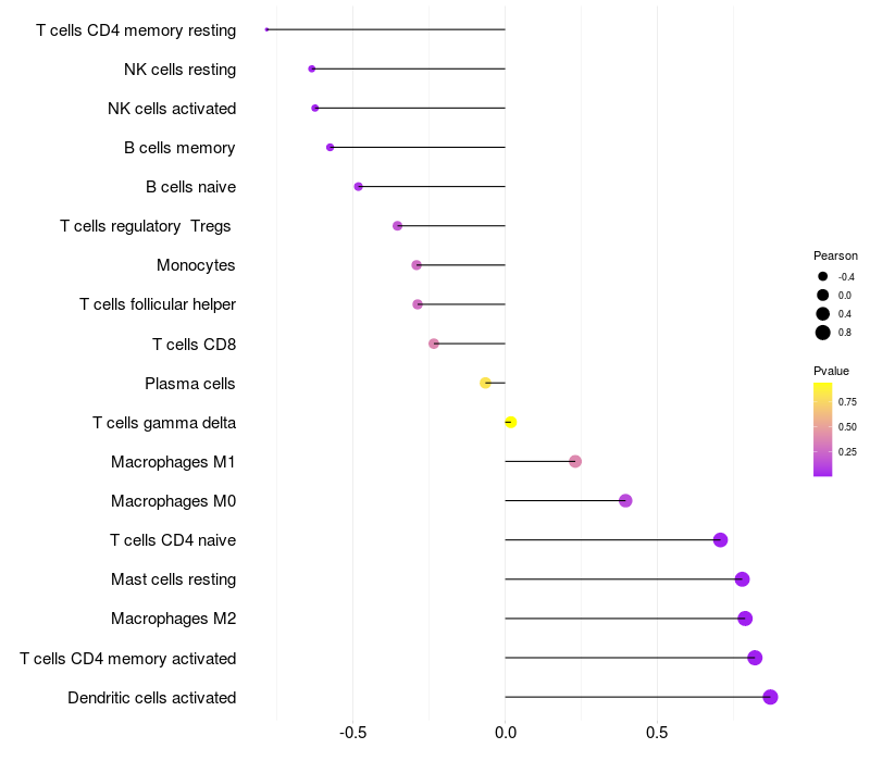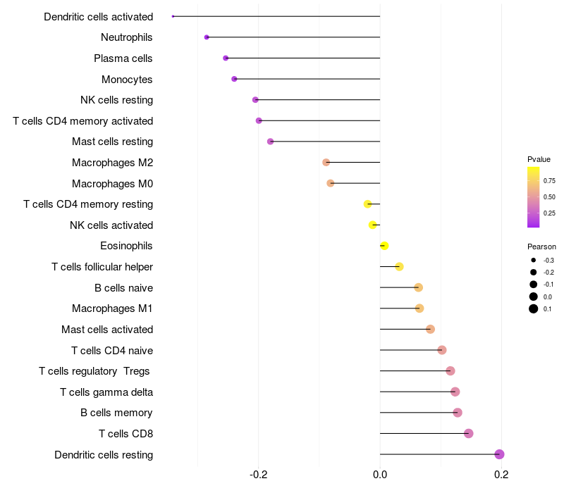 Lollipop of WWOX expression and immune infiltrating cell level correlation result in EBV+ samples