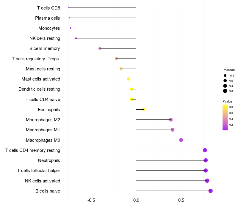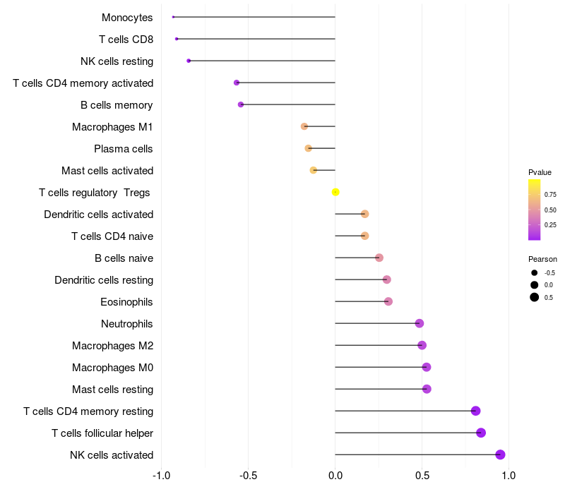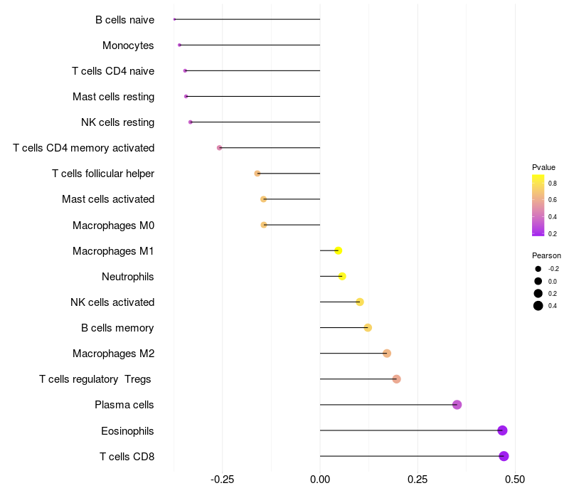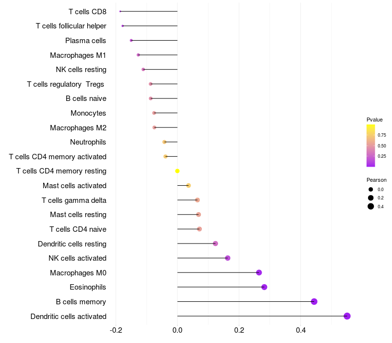 Lollipop of WWTR1 expression and immune infiltrating cell level correlation result in HBV+ Liver cirrhosis samples