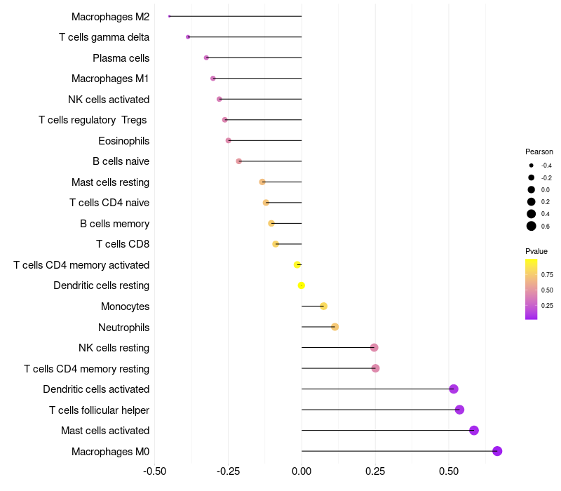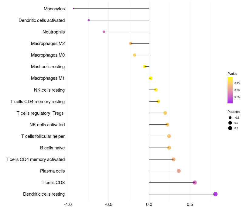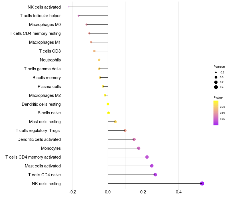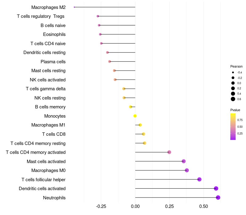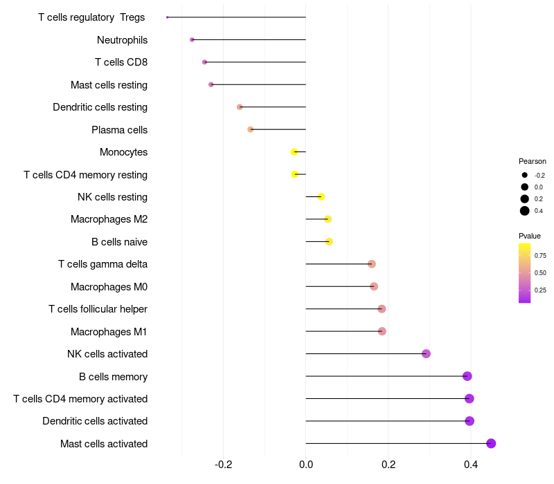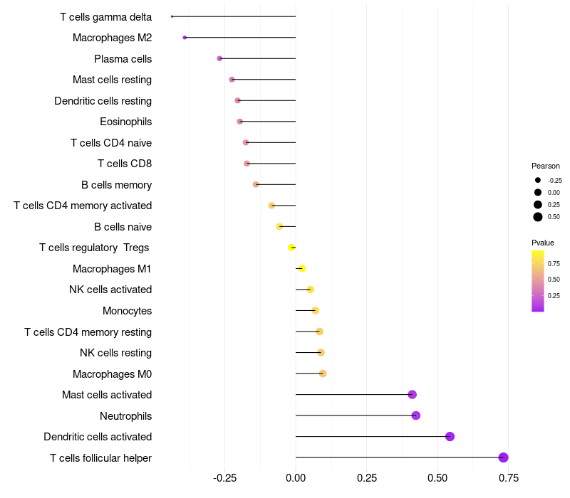 Lollipop of XAGE3 expression and immune infiltrating cell level correlation result in HPV+ samples