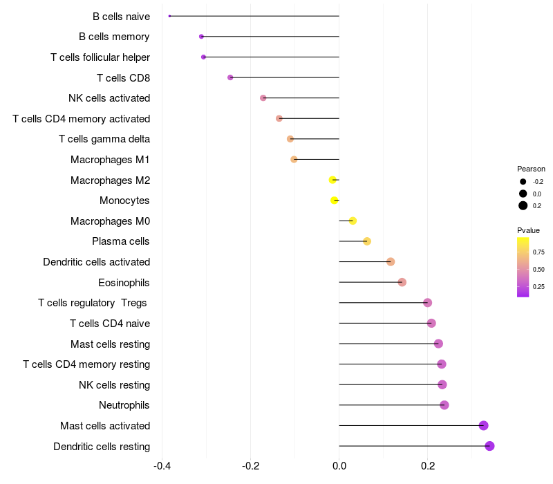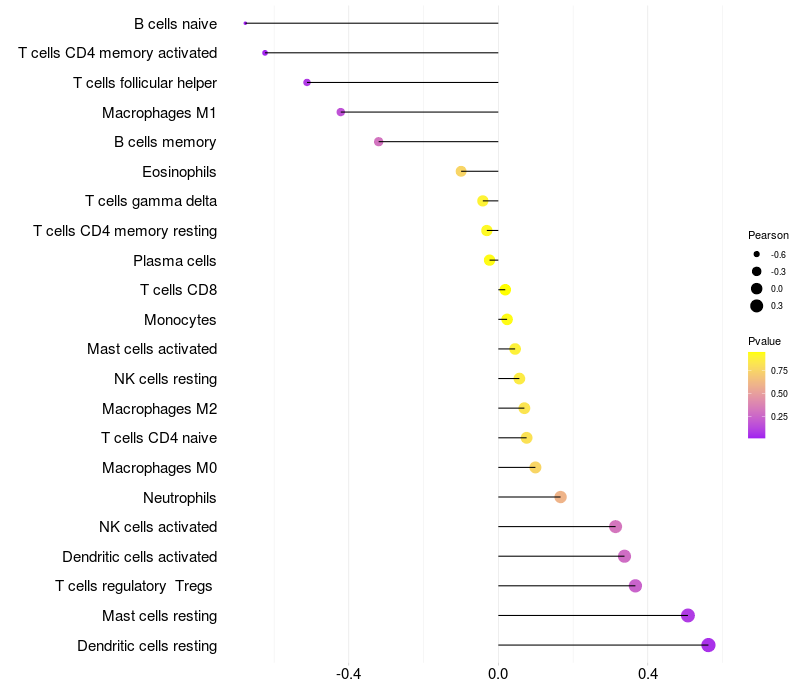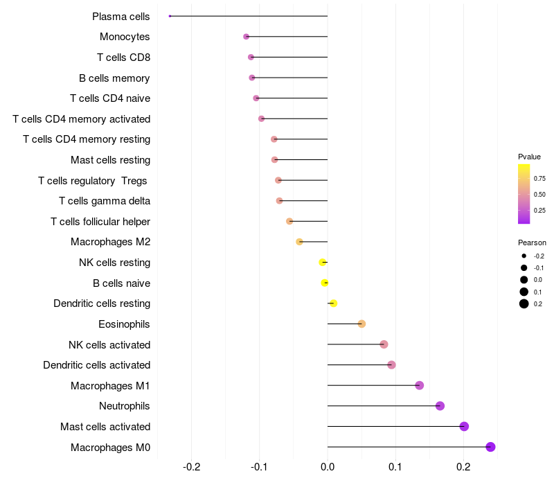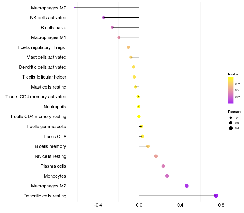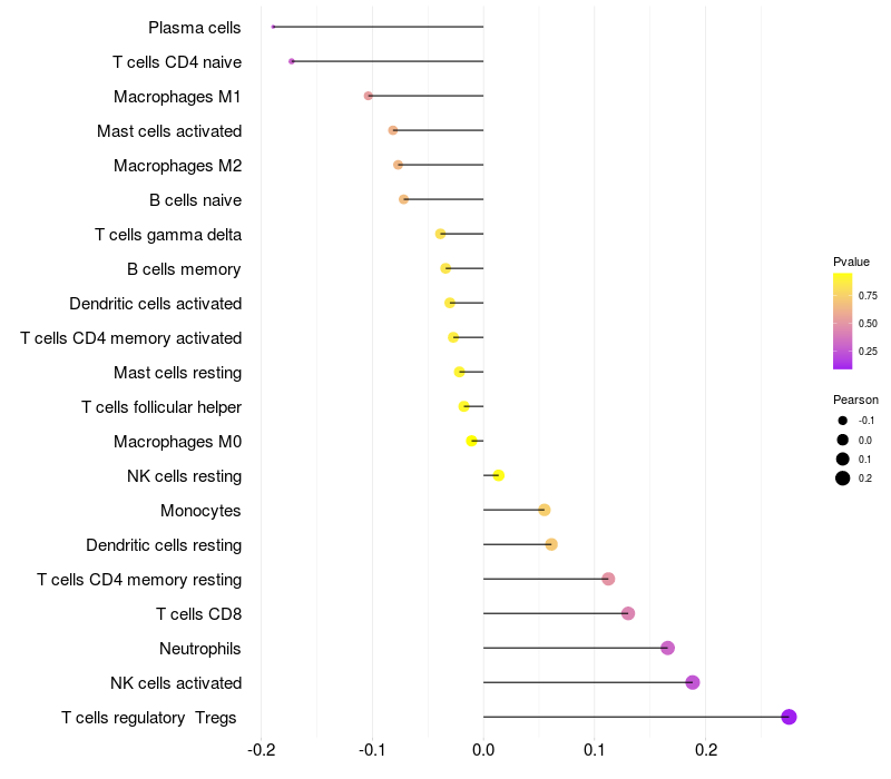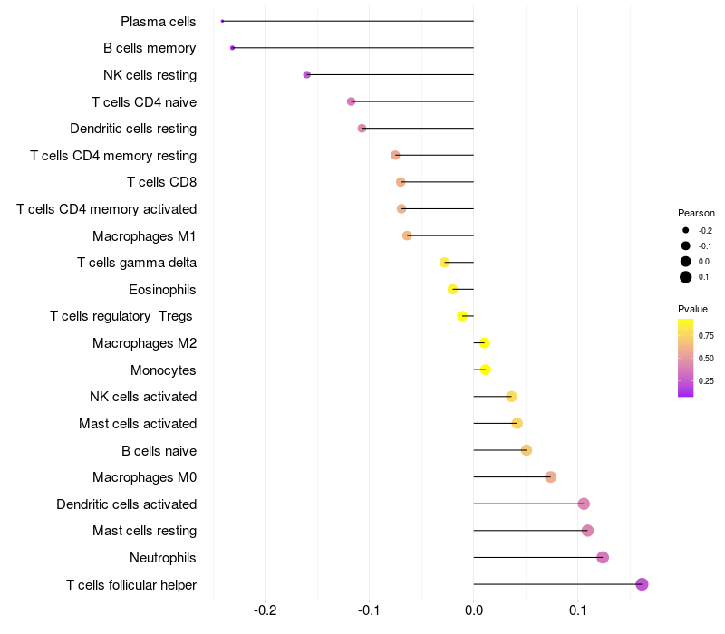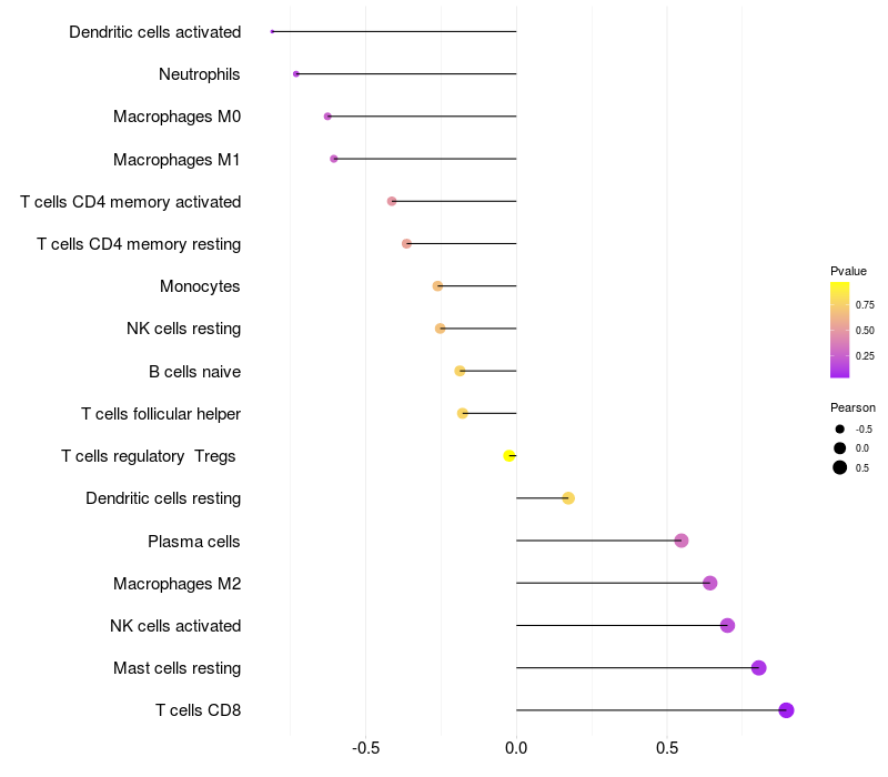 Lollipop of XG expression and immune infiltrating cell level correlation result in HPV+ samples