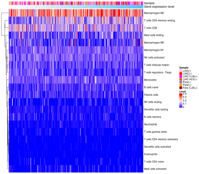 Liver hepatocellular carcinoma HCV (HBV+)(86), Liver hepatocellular carcinoma HCV (HBV-)(19), Liver hepatocellular carcinoma (HBV+)(209), Liver hepatocellular carcinoma (HBV+)(60), Paracancerous HCV (HBV+)(4), Paracancerous (HBV-)(28), Paracancerous (HBV+)(18) |