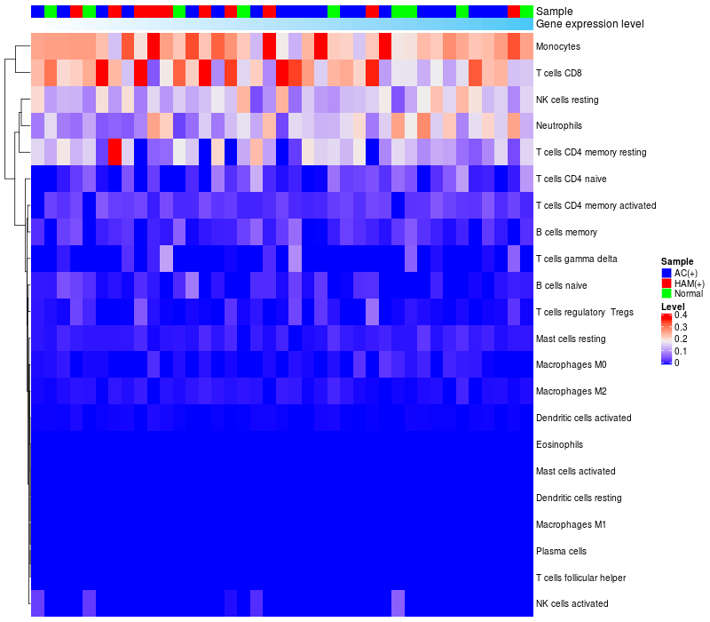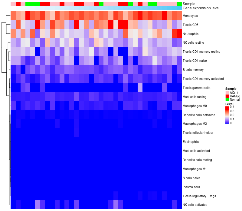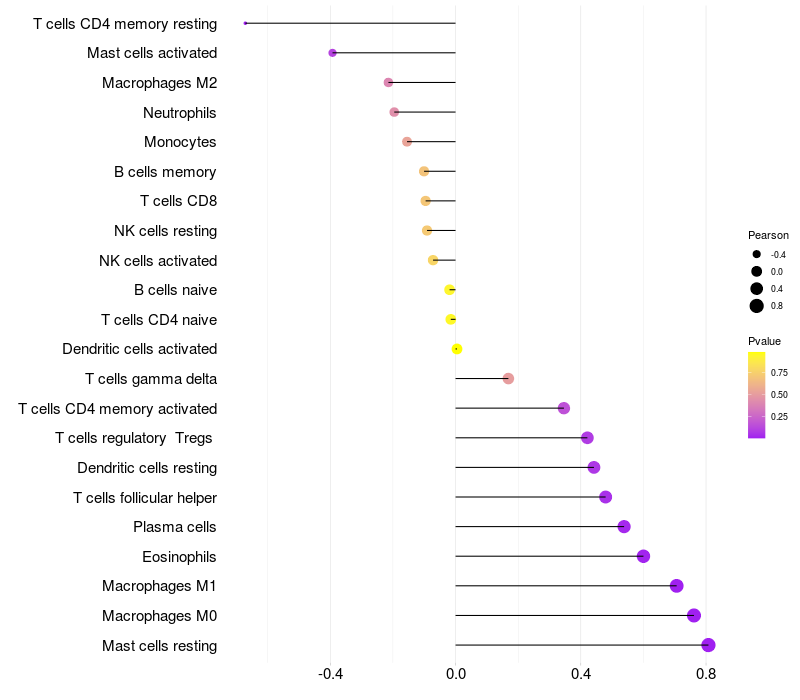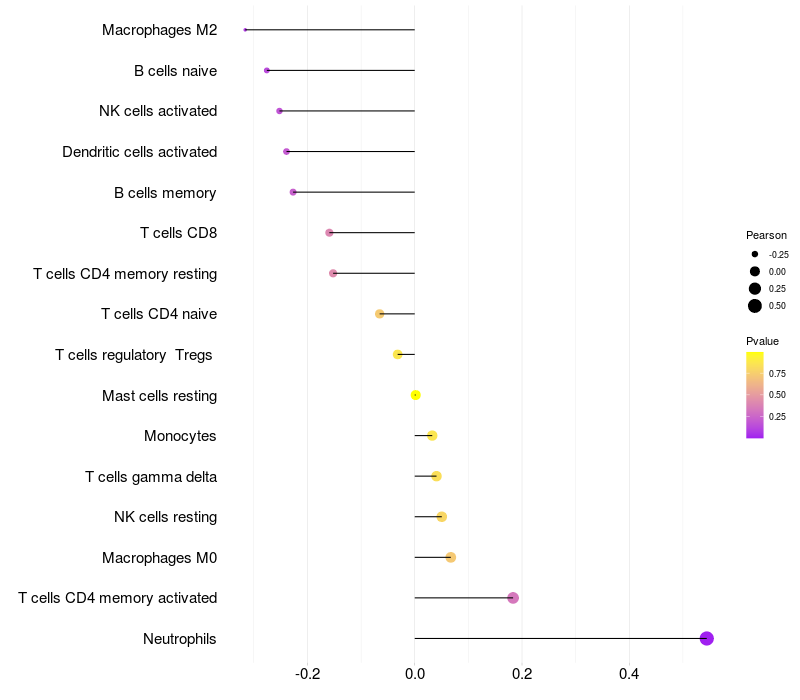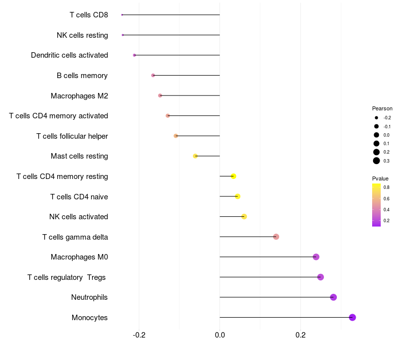 Lollipop of XKR3 expression and immune infiltrating cell level correlation result in HTLV1+ samples