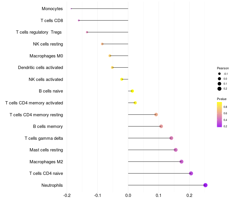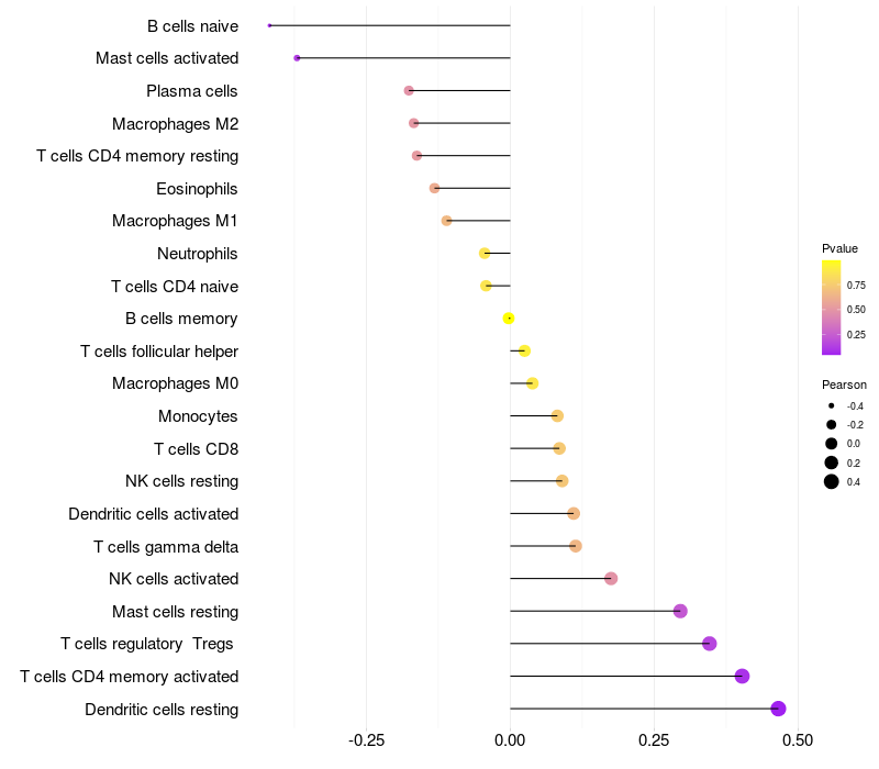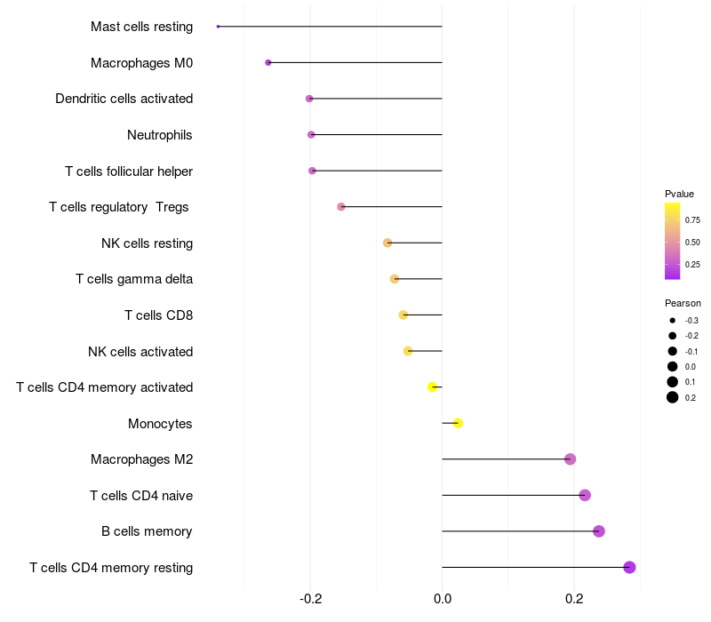 Lollipop of XKR5 expression and immune infiltrating cell level correlation result in HTLV1+ samples