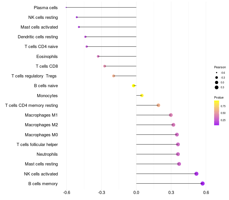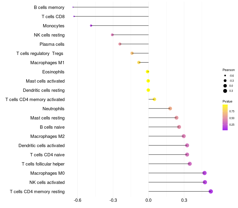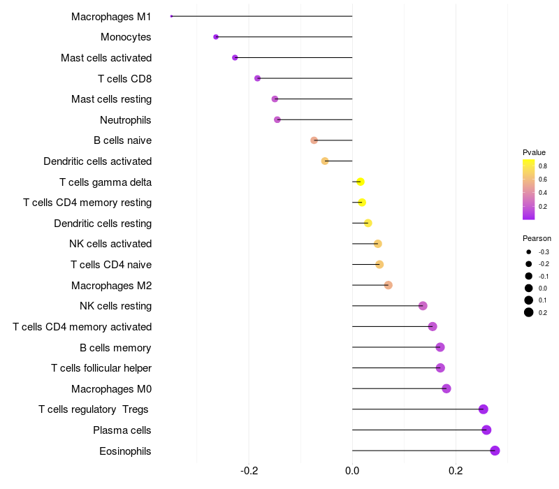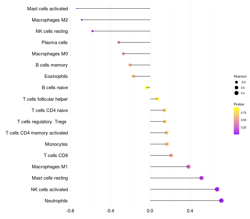 Lollipop of XPO6 expression and immune infiltrating cell level correlation result in HBV+ Liver cirrhosis samples