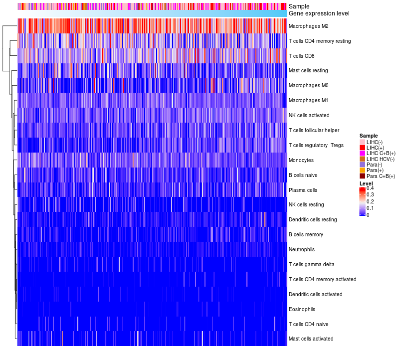 Liver hepatocellular carcinoma HCV (HBV+)(86), Liver hepatocellular carcinoma HCV (HBV-)(19), Liver hepatocellular carcinoma (HBV+)(209), Liver hepatocellular carcinoma (HBV+)(60), Paracancerous HCV (HBV+)(4), Paracancerous (HBV-)(28), Paracancerous (HBV+)(18) |