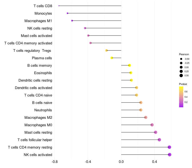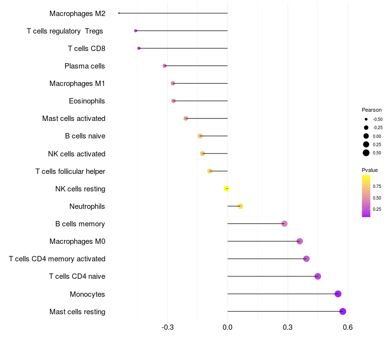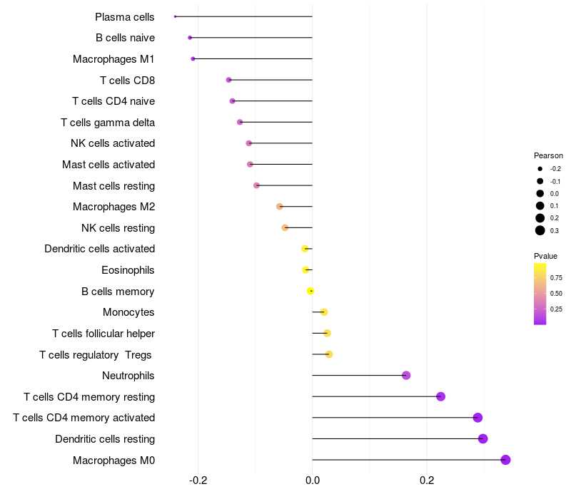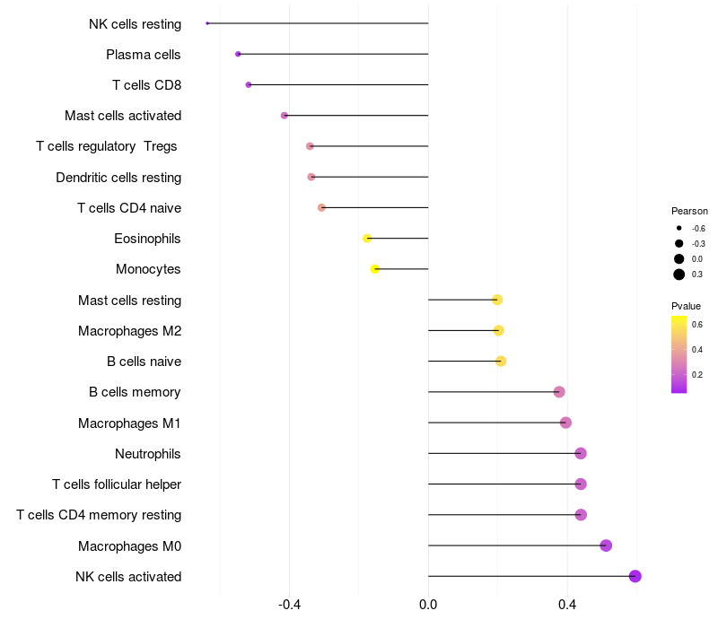Lollipop of XPR1 expression and immune infiltrating cell level correlation result in HBV+ Liver cirrhosis samples