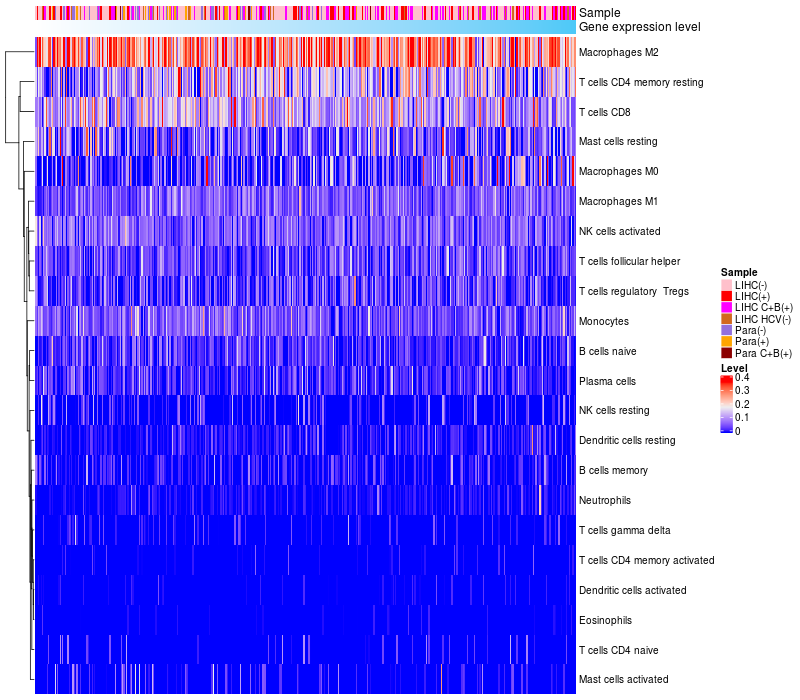 Liver hepatocellular carcinoma HCV (HBV+)(86), Liver hepatocellular carcinoma HCV (HBV-)(19), Liver hepatocellular carcinoma (HBV+)(209), Liver hepatocellular carcinoma (HBV+)(60), Paracancerous HCV (HBV+)(4), Paracancerous (HBV-)(28), Paracancerous (HBV+)(18) |