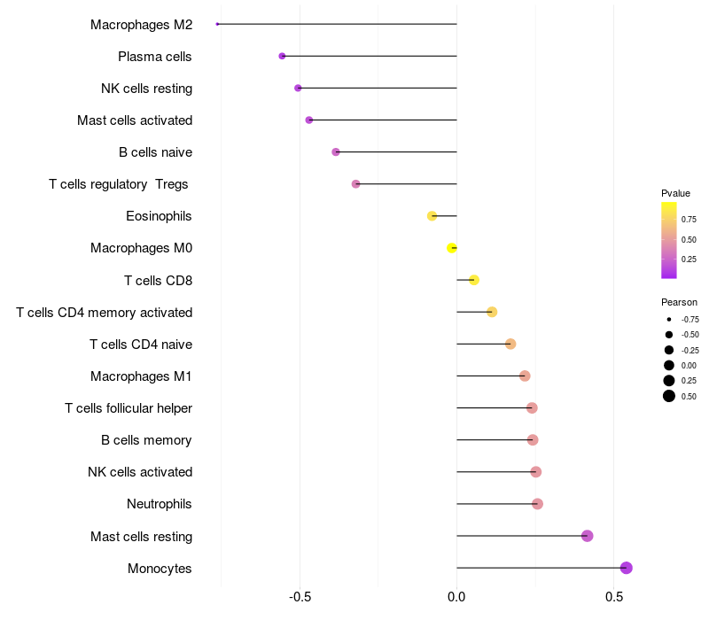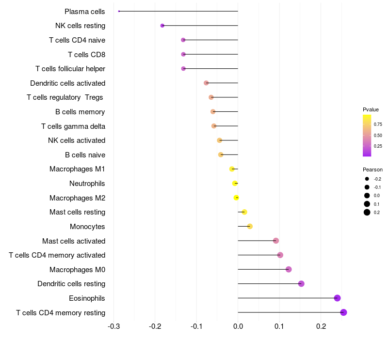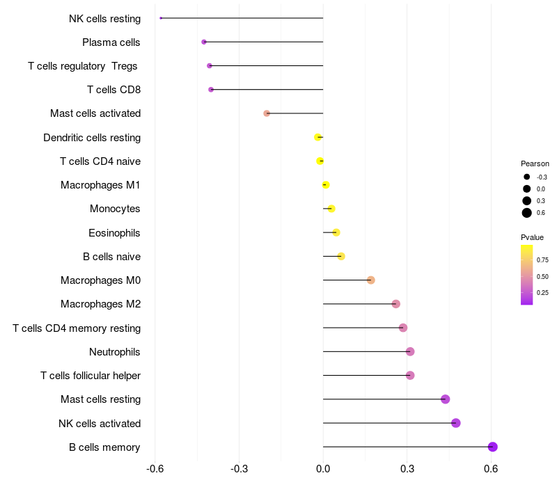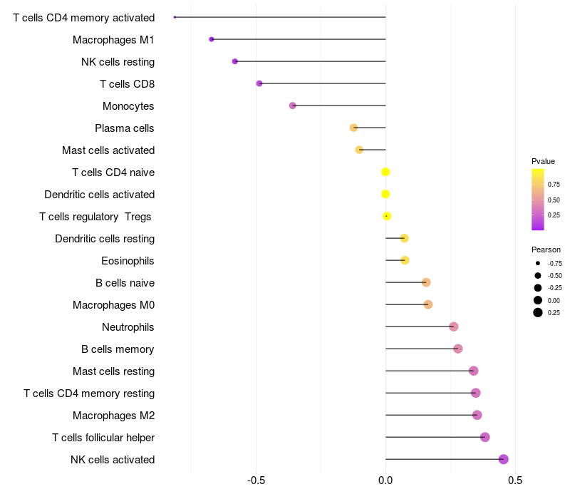 Lollipop of XRN2 expression and immune infiltrating cell level correlation result in HBV+ Chronic HBV (CHB) infection samples