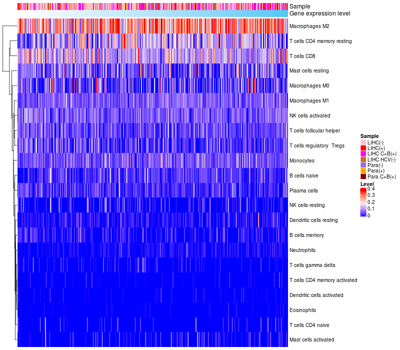 Liver hepatocellular carcinoma HCV (HBV+)(86), Liver hepatocellular carcinoma HCV (HBV-)(19), Liver hepatocellular carcinoma (HBV+)(209), Liver hepatocellular carcinoma (HBV+)(60), Paracancerous HCV (HBV+)(4), Paracancerous (HBV-)(28), Paracancerous (HBV+)(18) |
