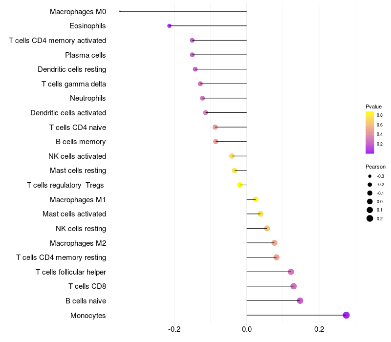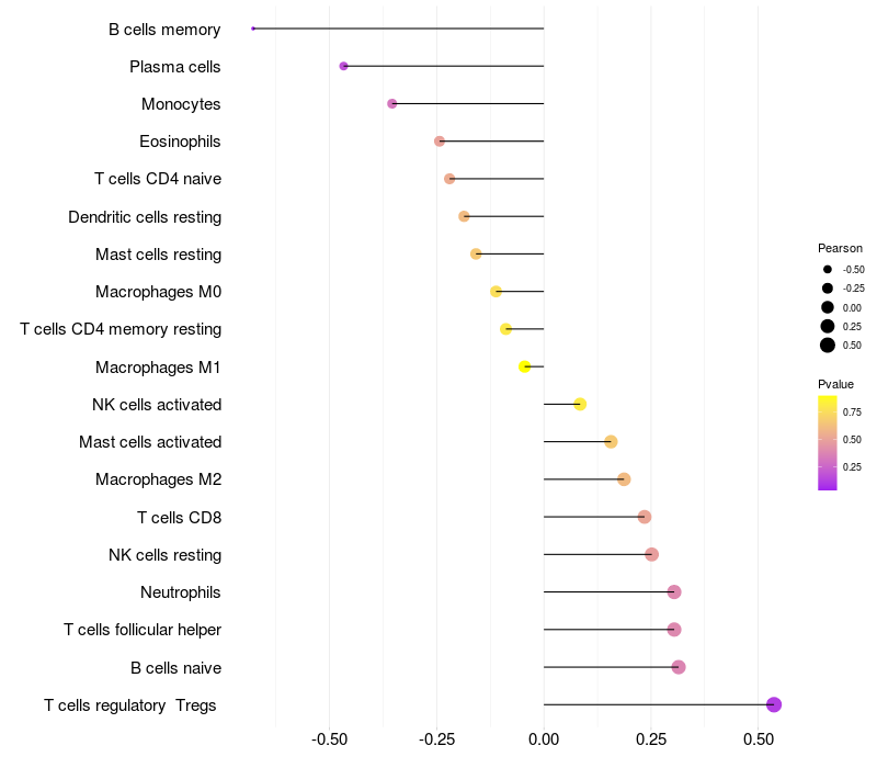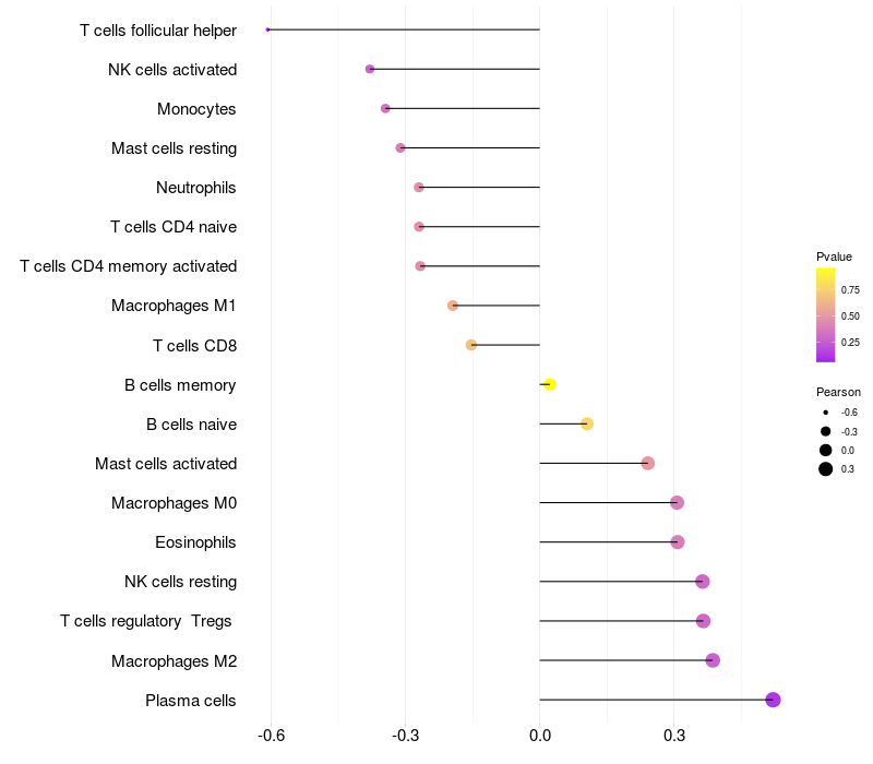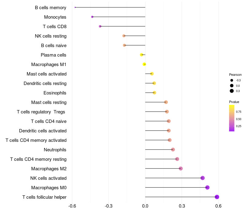 Lollipop of XYLB expression and immune infiltrating cell level correlation result in HBV+ Liver cirrhosis samples