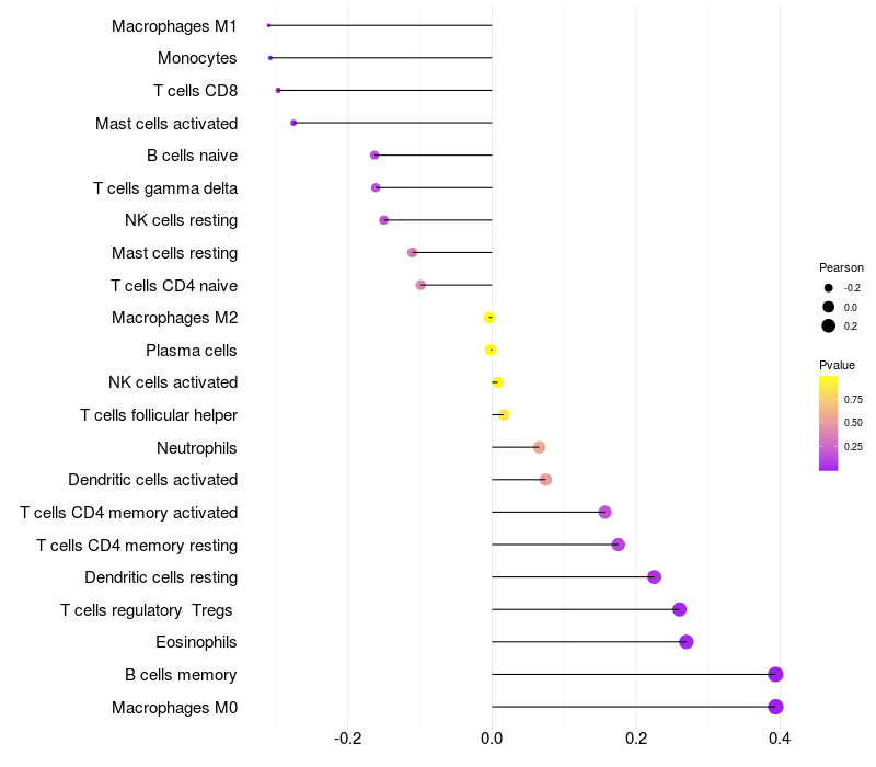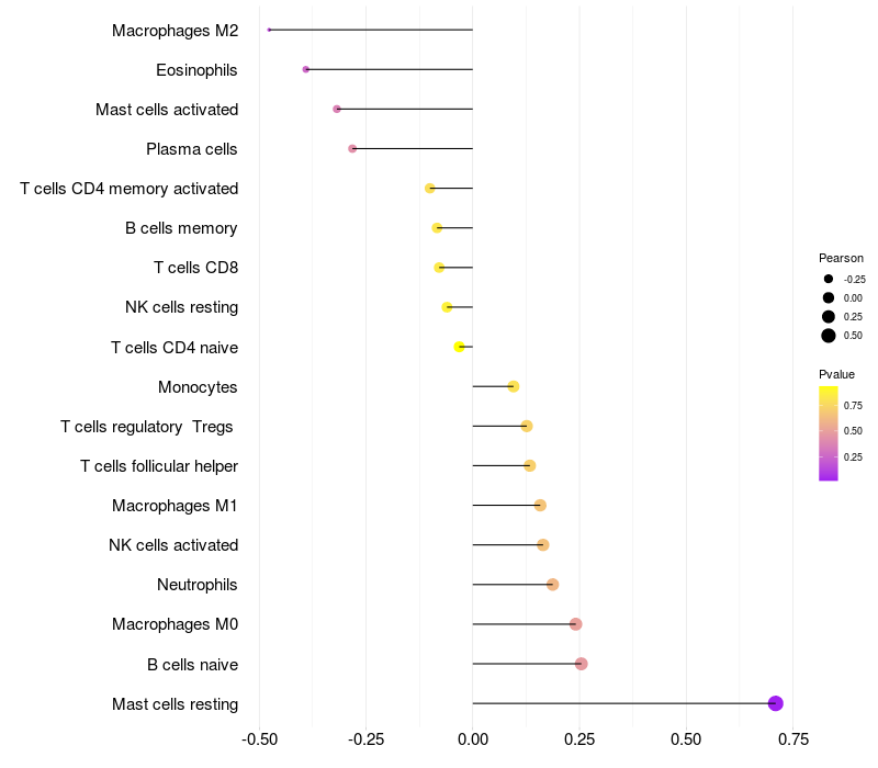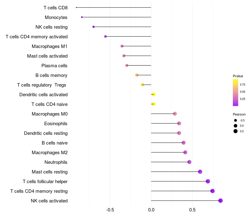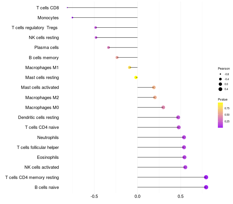 Lollipop of YEATS2 expression and immune infiltrating cell level correlation result in HBV+ Liver cirrhosis samples