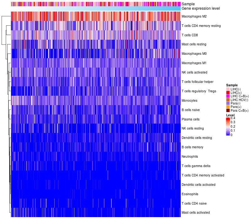 Liver hepatocellular carcinoma HCV (HBV+)(86), Liver hepatocellular carcinoma HCV (HBV-)(19), Liver hepatocellular carcinoma (HBV+)(209), Liver hepatocellular carcinoma (HBV+)(60), Paracancerous HCV (HBV+)(4), Paracancerous (HBV-)(28), Paracancerous (HBV+)(18) |