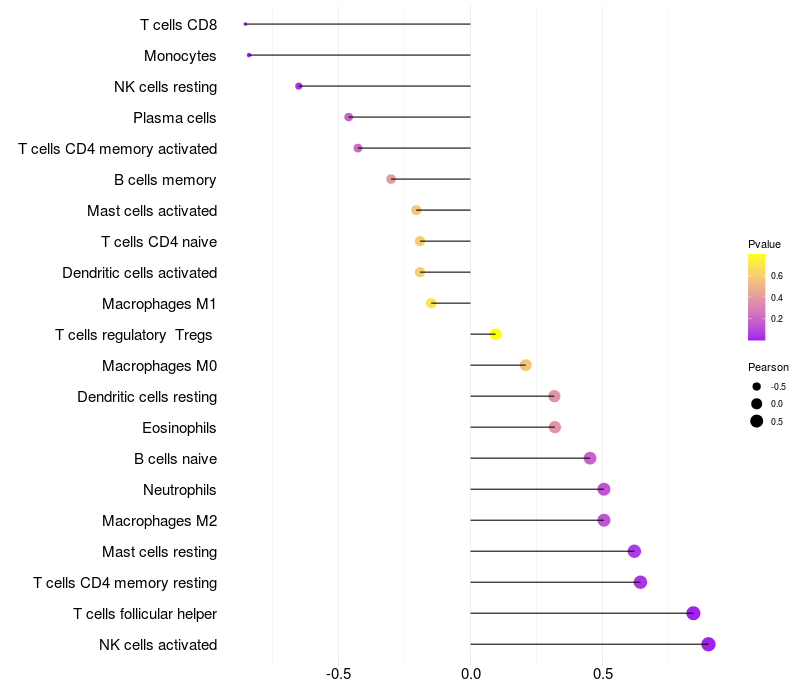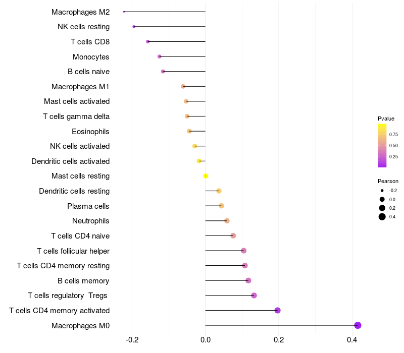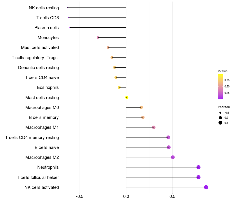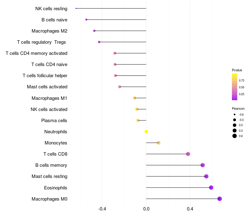 Lollipop of YEATS4 expression and immune infiltrating cell level correlation result in HBV+ Liver cirrhosis samples