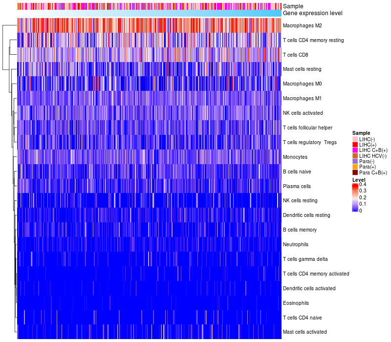 Liver hepatocellular carcinoma HCV (HBV+)(86), Liver hepatocellular carcinoma HCV (HBV-)(19), Liver hepatocellular carcinoma (HBV+)(209), Liver hepatocellular carcinoma (HBV+)(60), Paracancerous HCV (HBV+)(4), Paracancerous (HBV-)(28), Paracancerous (HBV+)(18) |