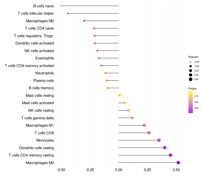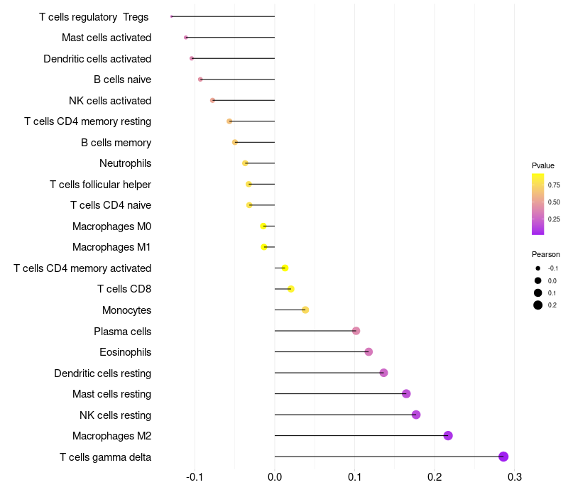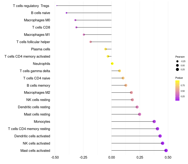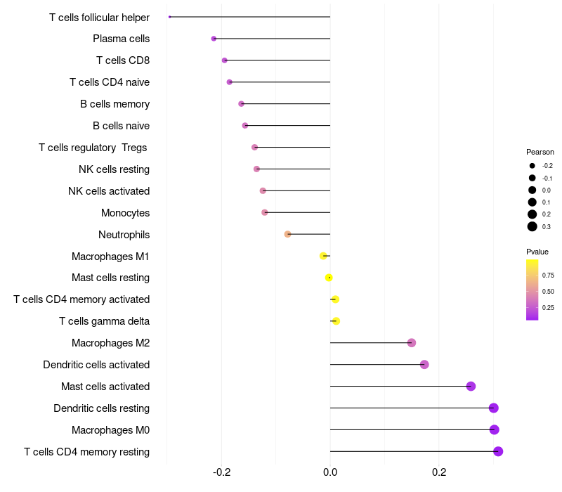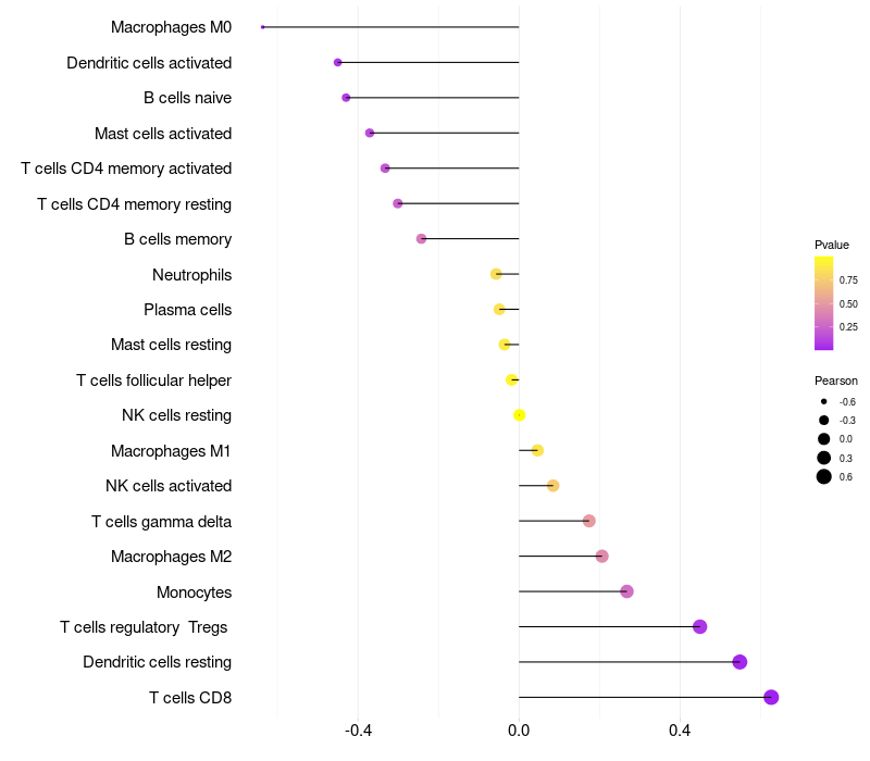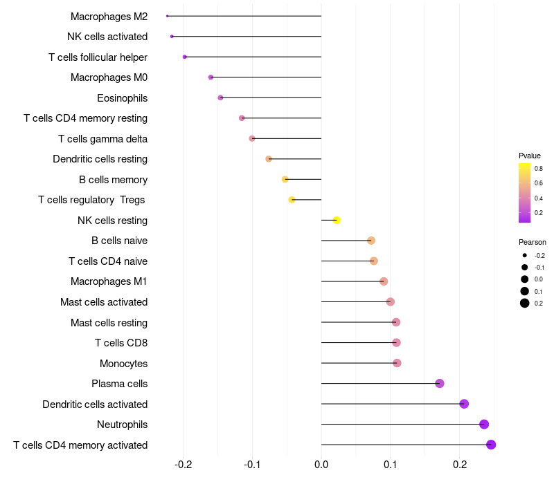 Lollipop of YIPF5 expression and immune infiltrating cell level correlation result in HPV+ samples