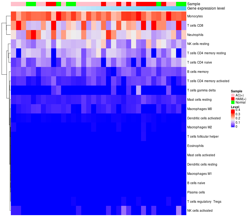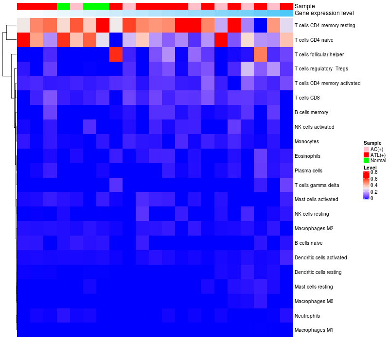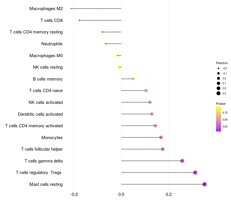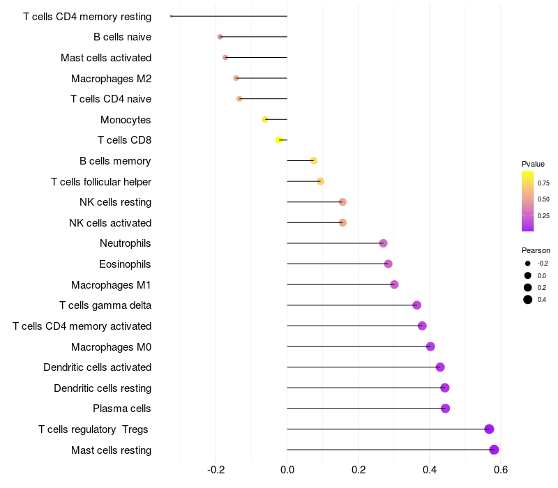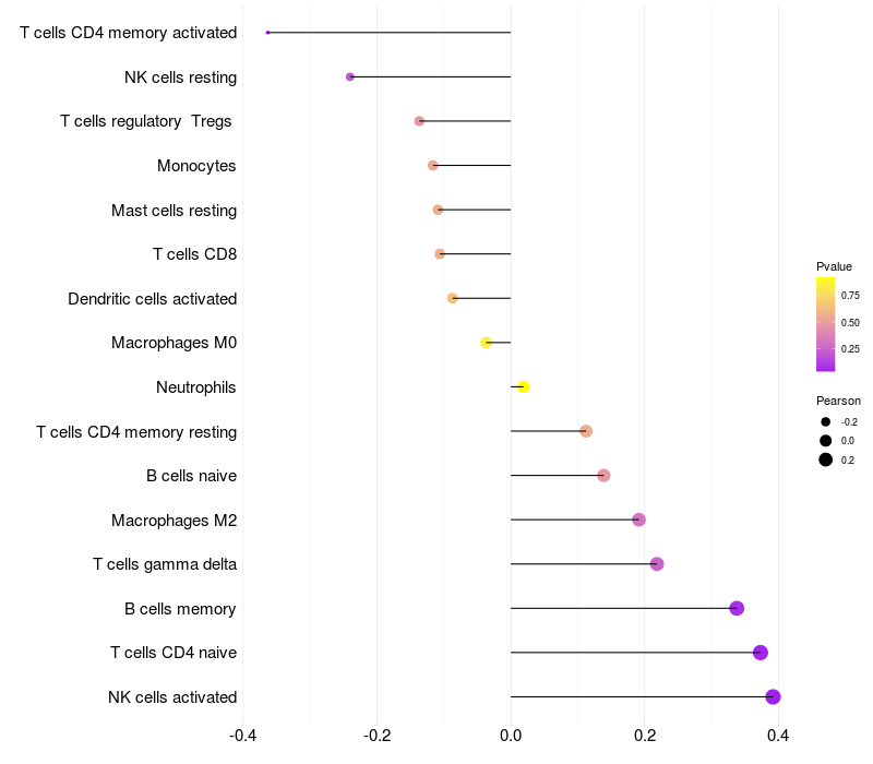 Lollipop of YKT6 expression and immune infiltrating cell level correlation result in HTLV1+ samples