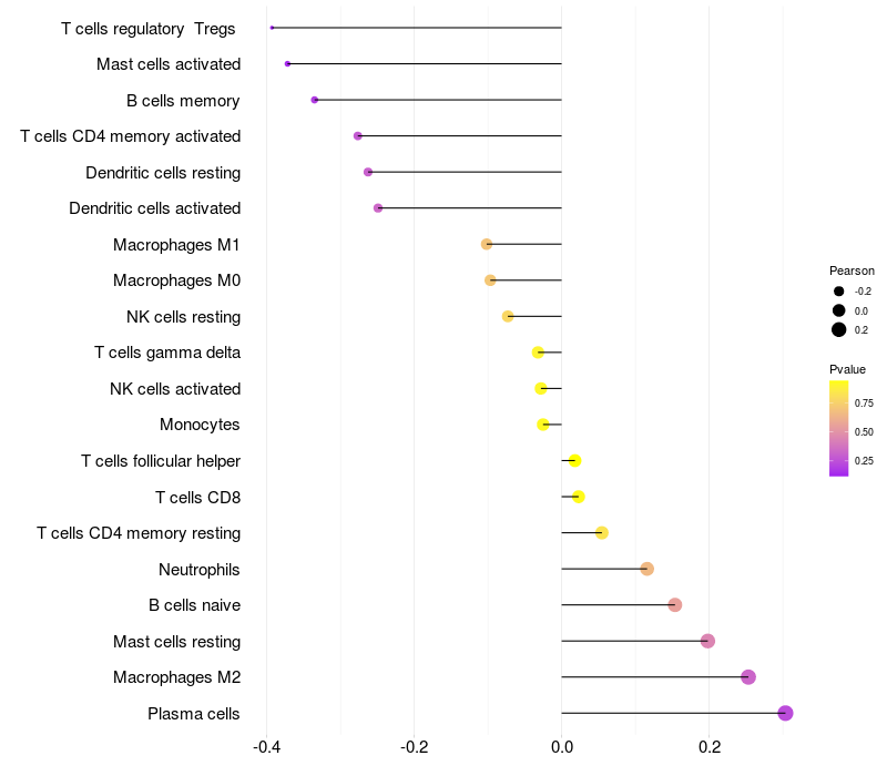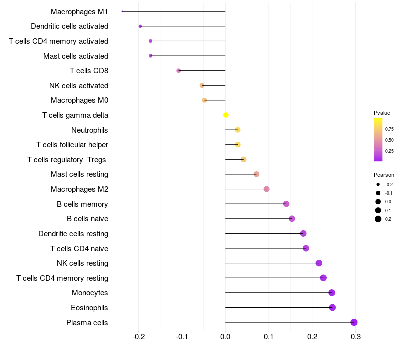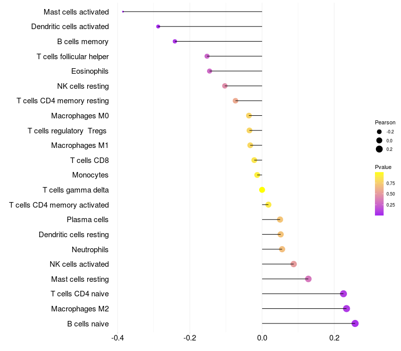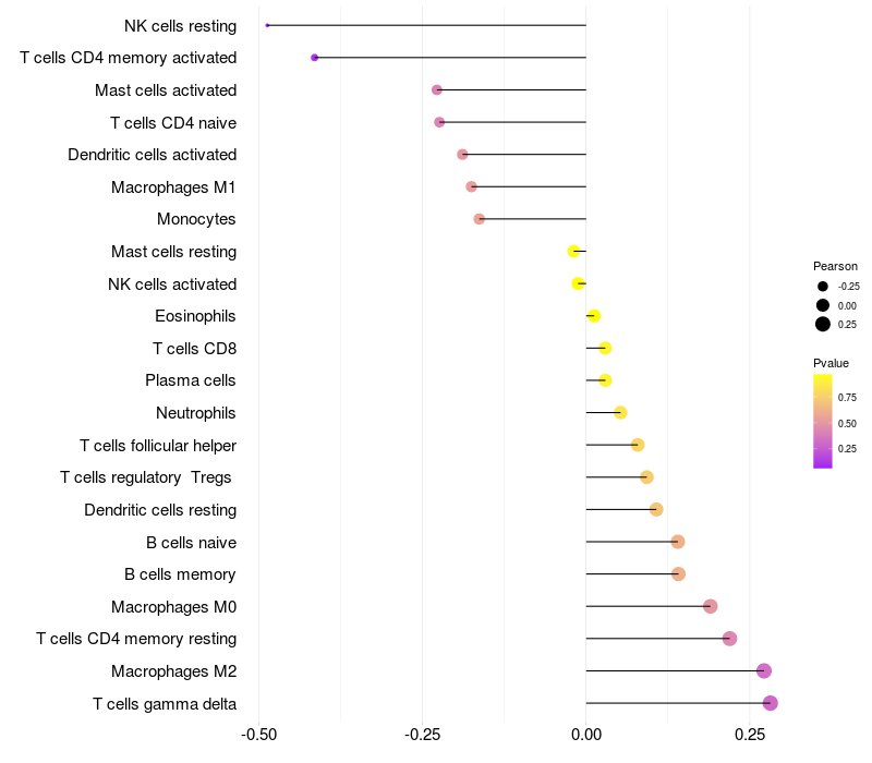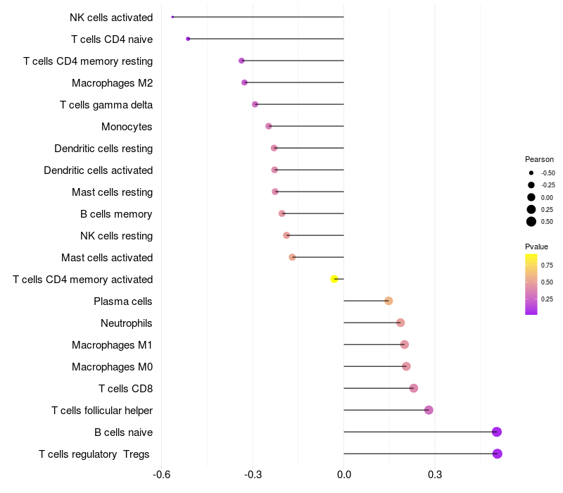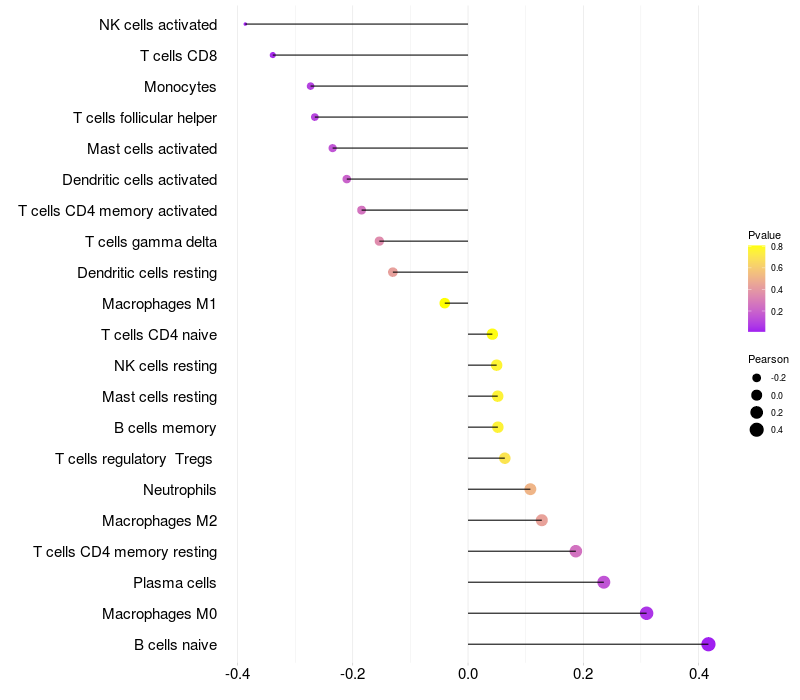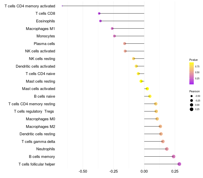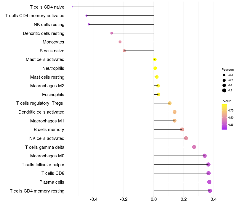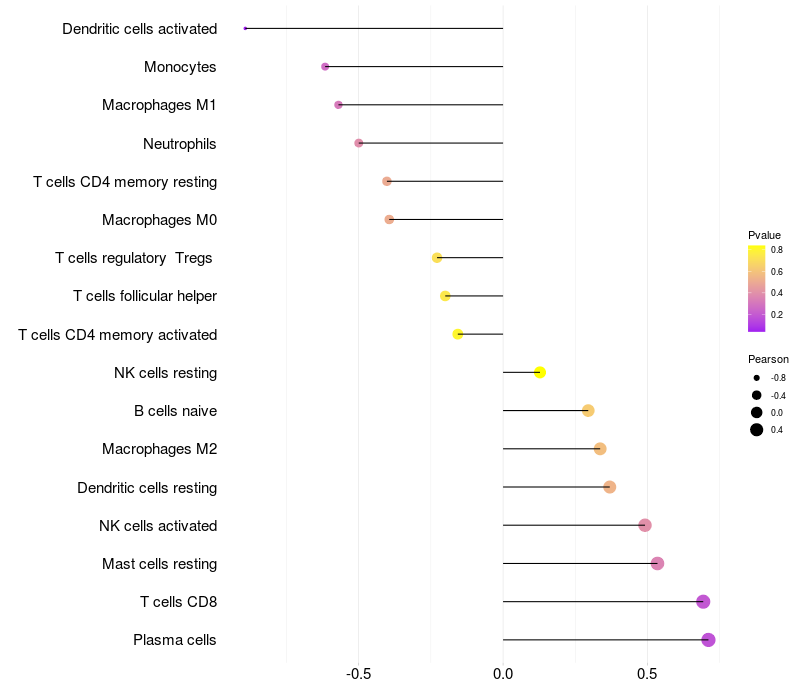 Lollipop of YPEL2 expression and immune infiltrating cell level correlation result in HPV+ samples