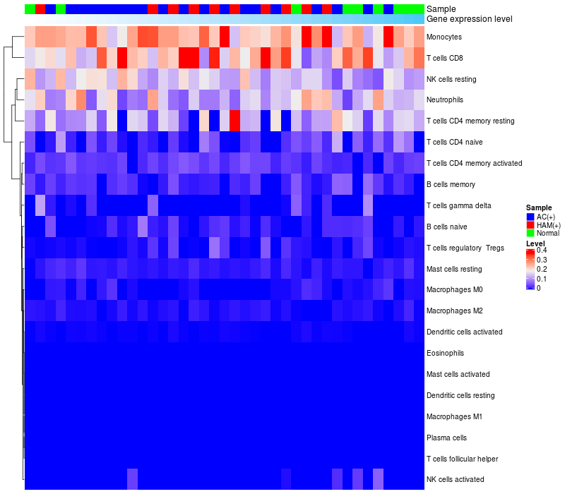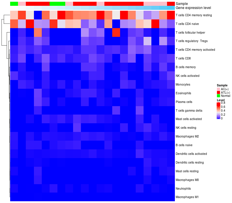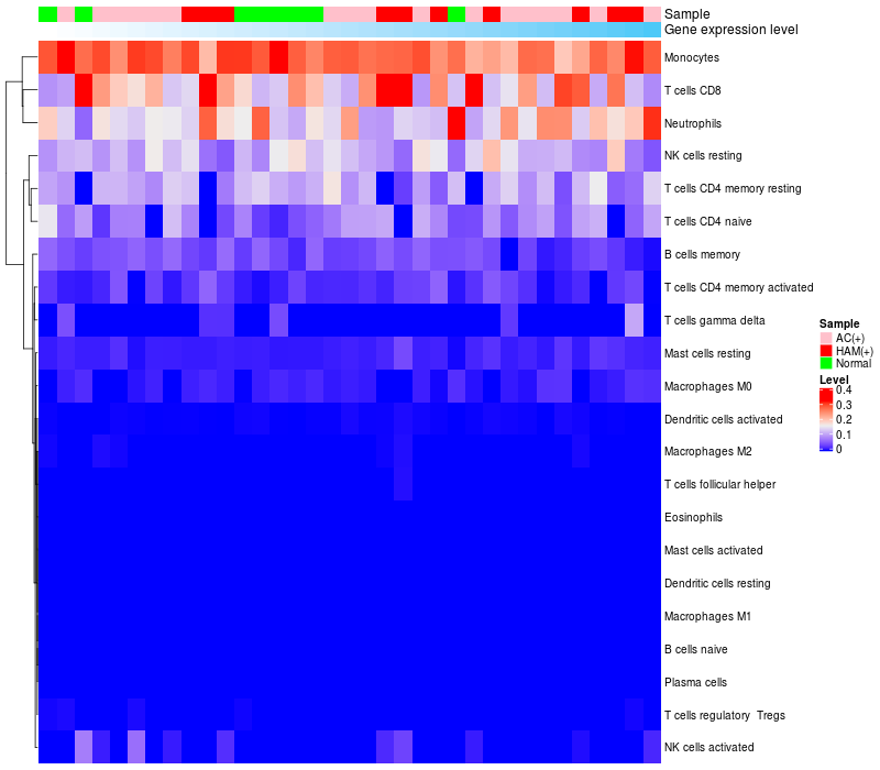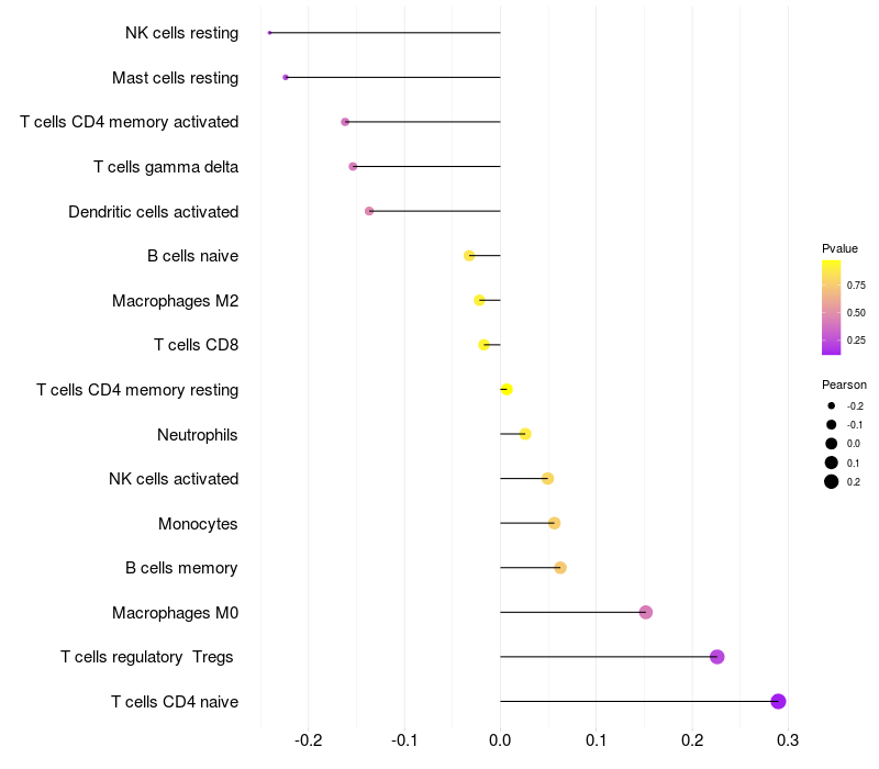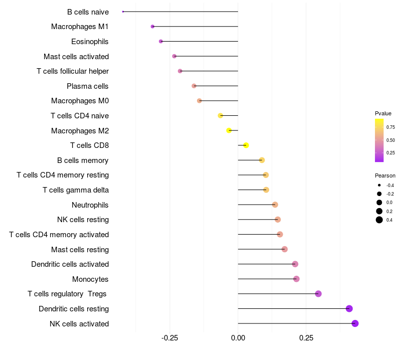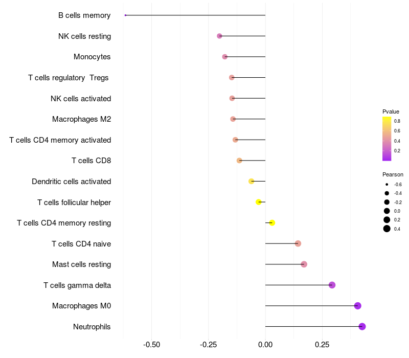Lollipop of YTHDC1 expression and immune infiltrating cell level correlation result in HTLV1+ samples