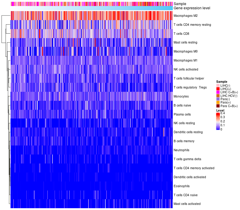 Liver hepatocellular carcinoma HCV (HBV+)(86), Liver hepatocellular carcinoma HCV (HBV-)(19), Liver hepatocellular carcinoma (HBV+)(209), Liver hepatocellular carcinoma (HBV+)(60), Paracancerous HCV (HBV+)(4), Paracancerous (HBV-)(28), Paracancerous (HBV+)(18) |
