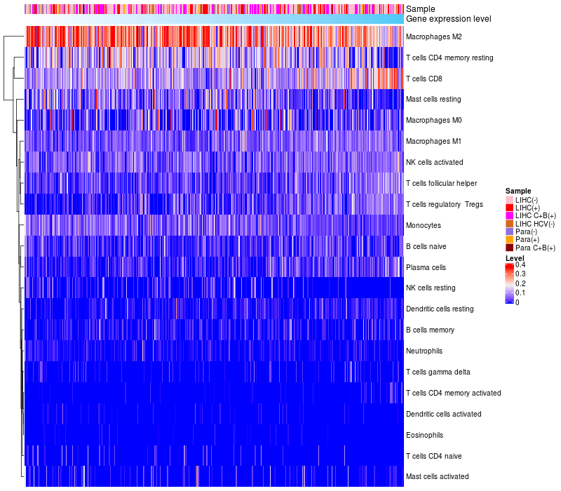 Liver hepatocellular carcinoma HCV (HBV+)(86), Liver hepatocellular carcinoma HCV (HBV-)(19), Liver hepatocellular carcinoma (HBV+)(209), Liver hepatocellular carcinoma (HBV+)(60), Paracancerous HCV (HBV+)(4), Paracancerous (HBV-)(28), Paracancerous (HBV+)(18) |