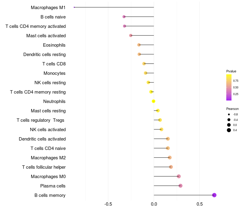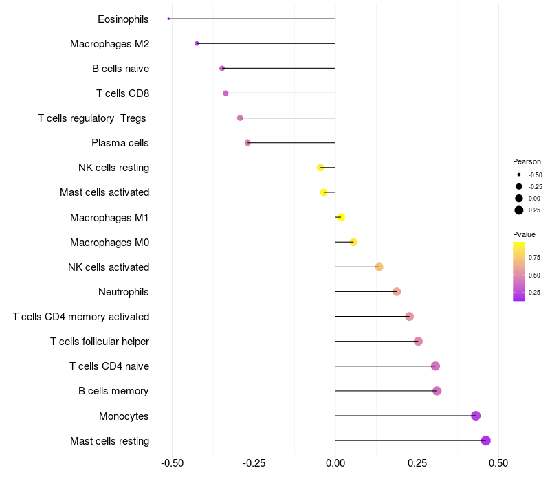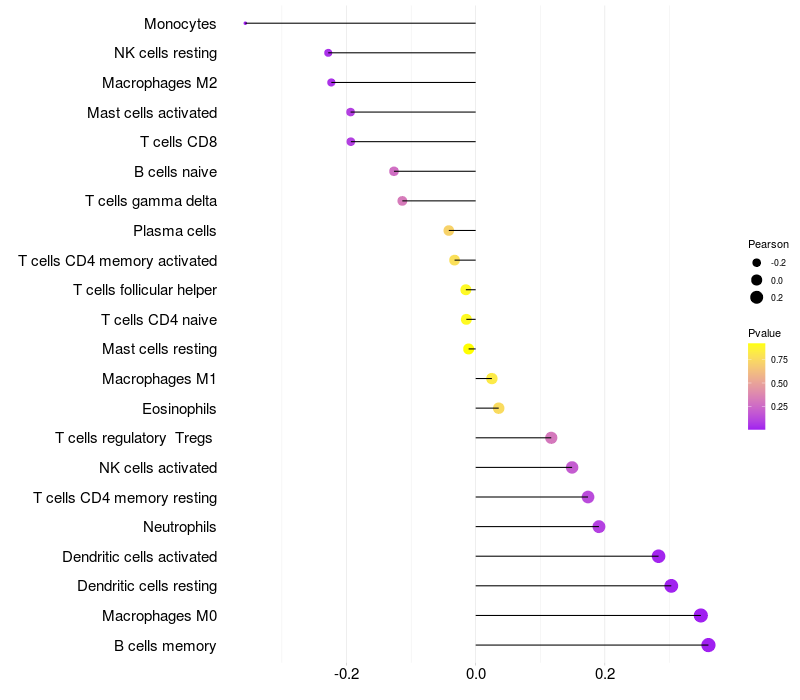 Lollipop of ZC3H11A expression and immune infiltrating cell level correlation result in HBV+ Chronic HBV (CHB) infection samples