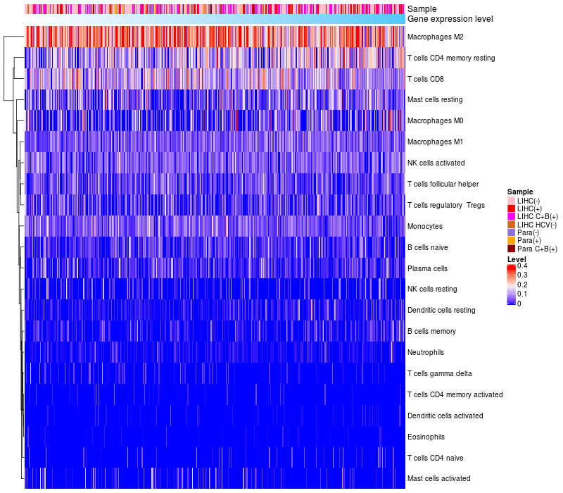 Liver hepatocellular carcinoma HCV (HBV+)(86), Liver hepatocellular carcinoma HCV (HBV-)(19), Liver hepatocellular carcinoma (HBV+)(209), Liver hepatocellular carcinoma (HBV+)(60), Paracancerous HCV (HBV+)(4), Paracancerous (HBV-)(28), Paracancerous (HBV+)(18) |