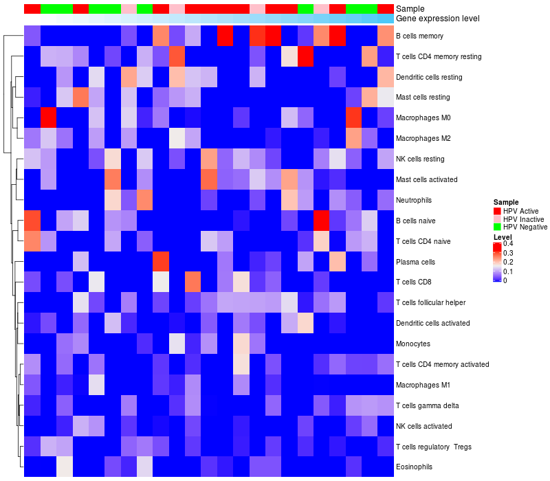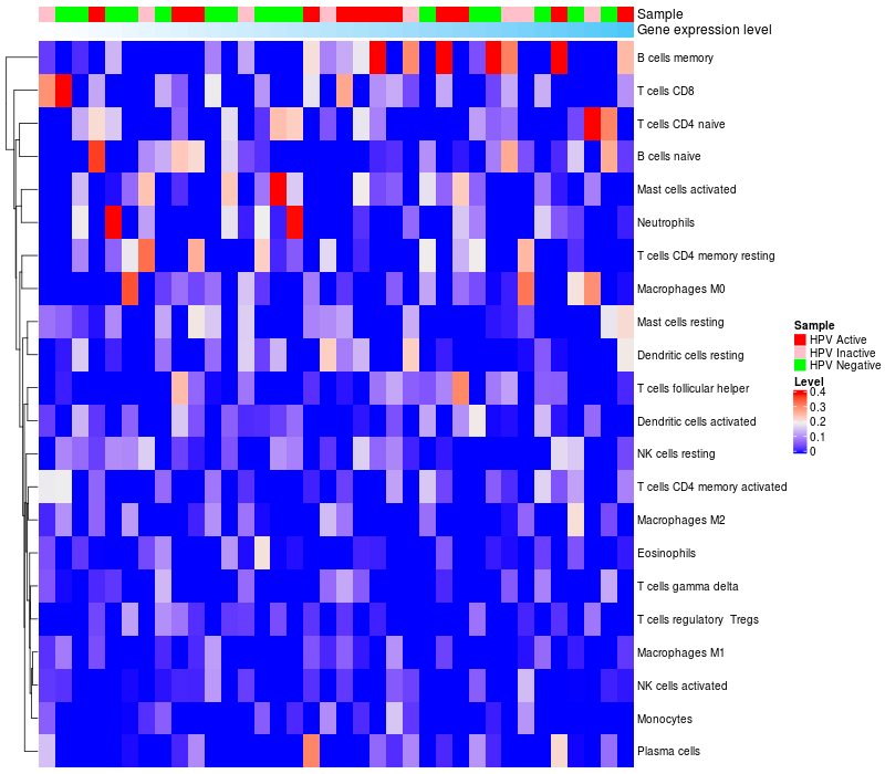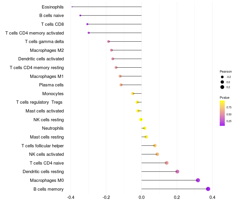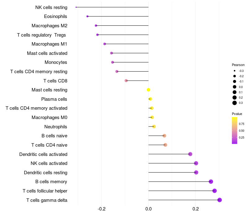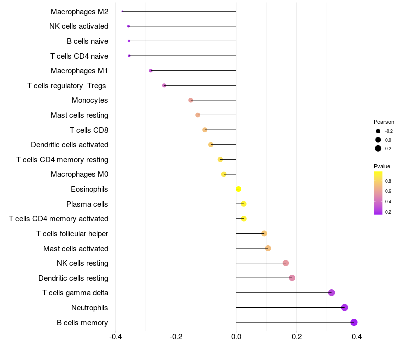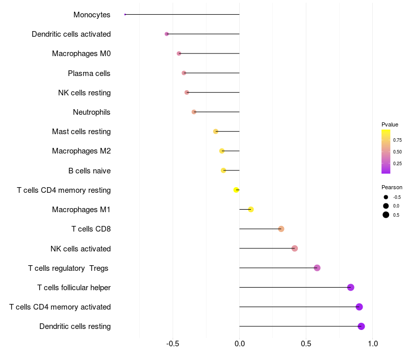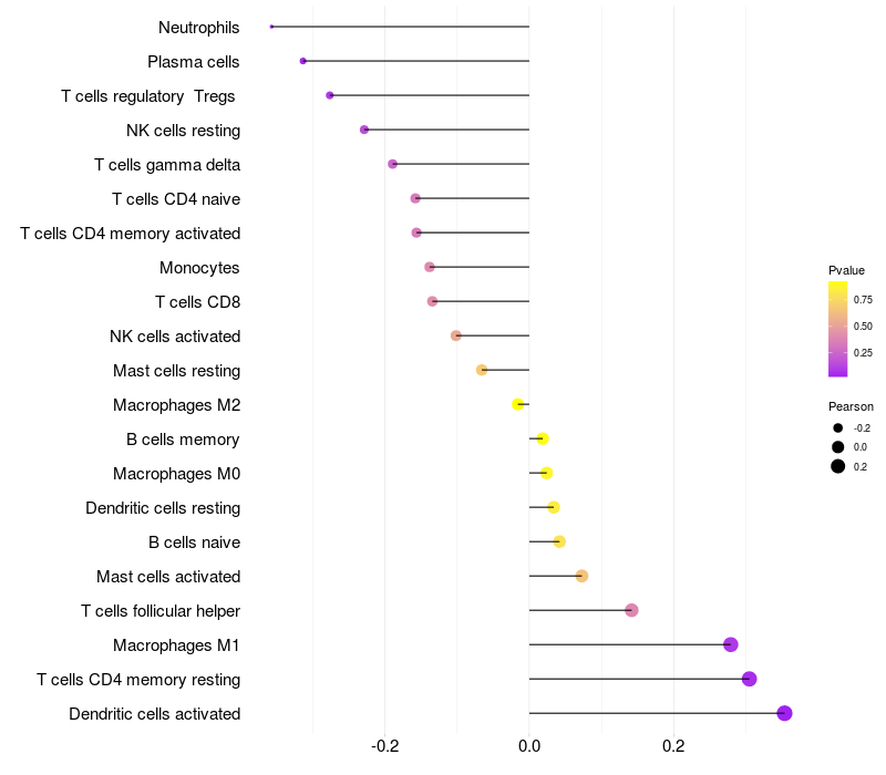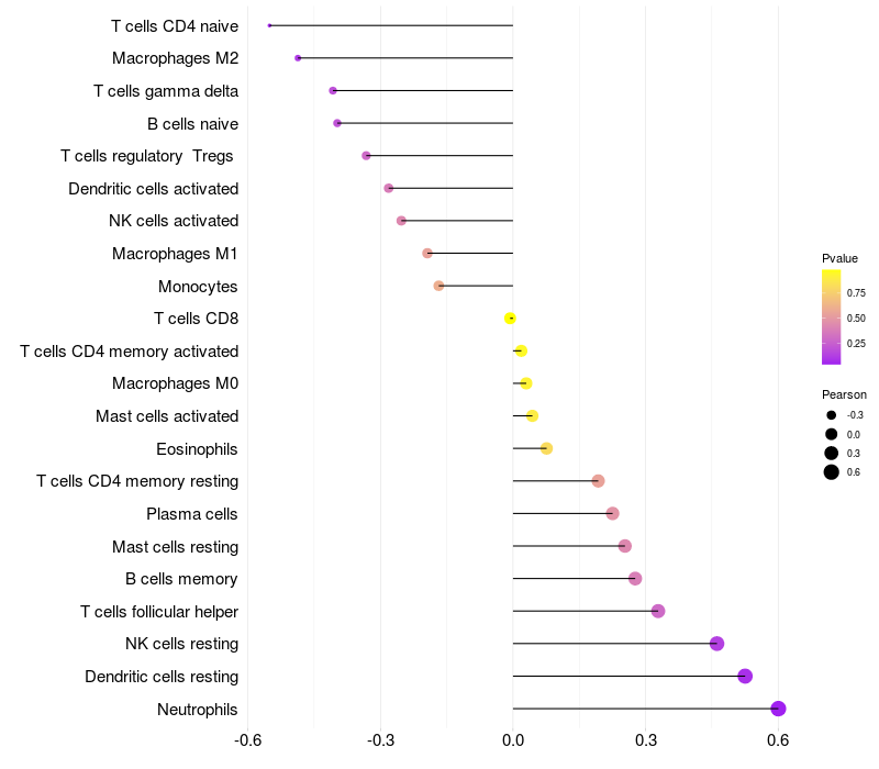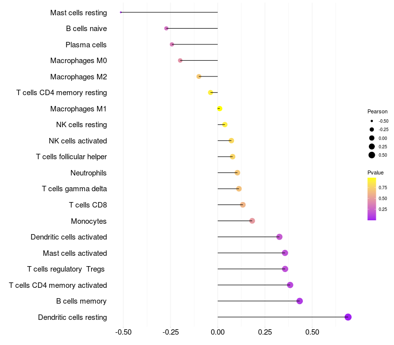Lollipop of ZDBF2 expression and immune infiltrating cell level correlation result in HPV+ samples
