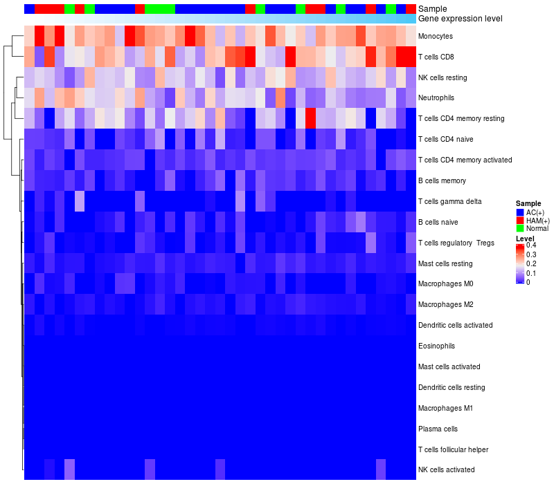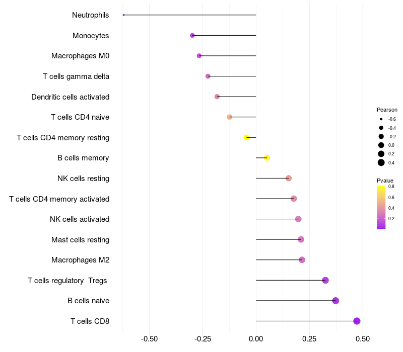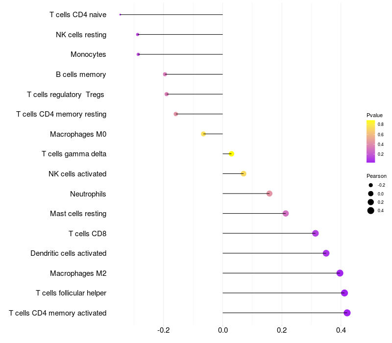 Lollipop of ZHX1 expression and immune infiltrating cell level correlation result in HTLV1+ samples