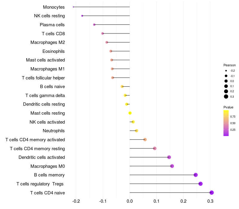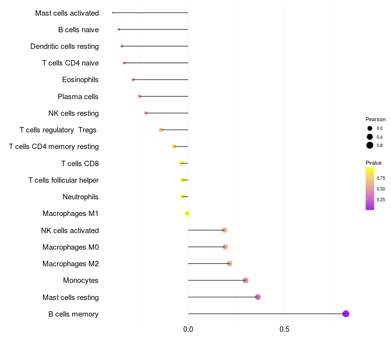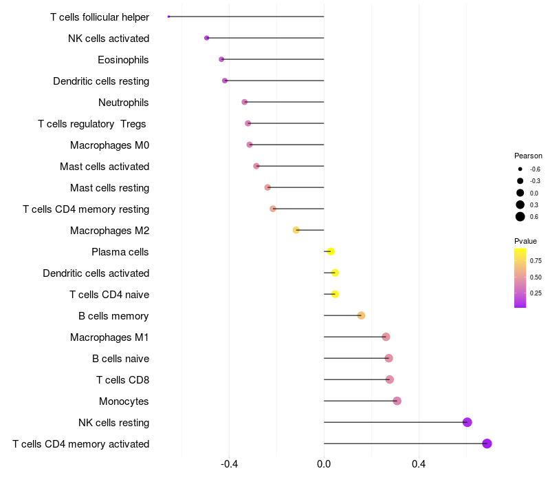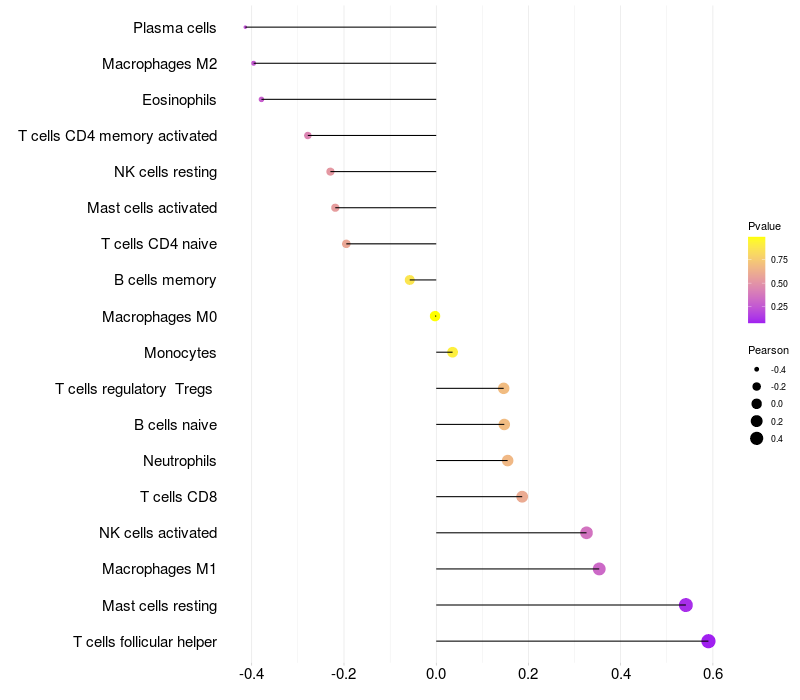 Lollipop of ZHX2 expression and immune infiltrating cell level correlation result in HBV+ Liver cirrhosis samples
