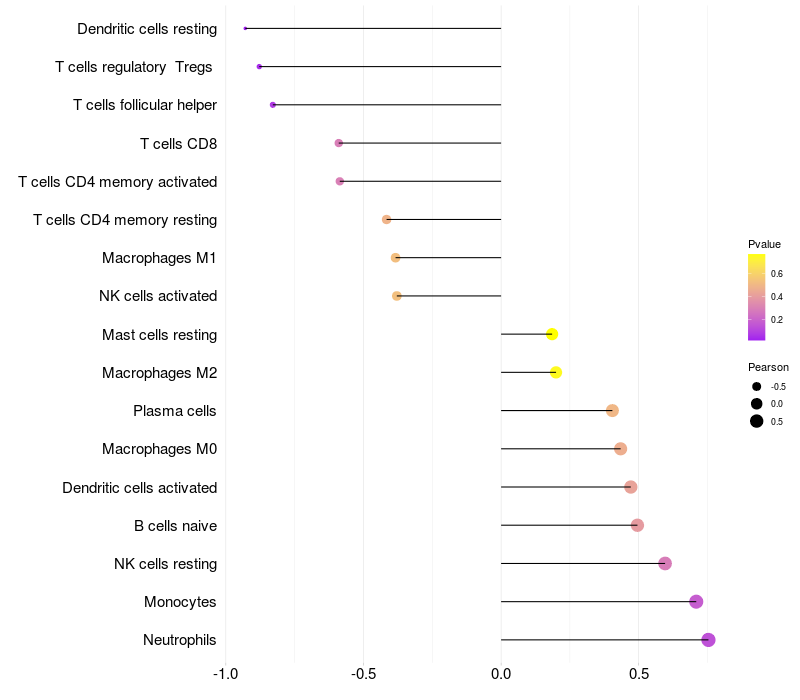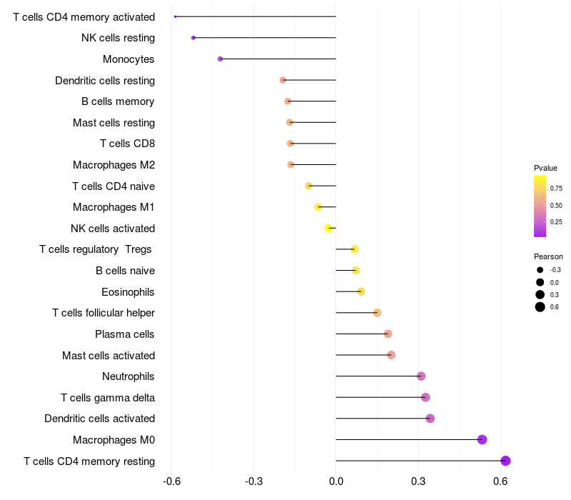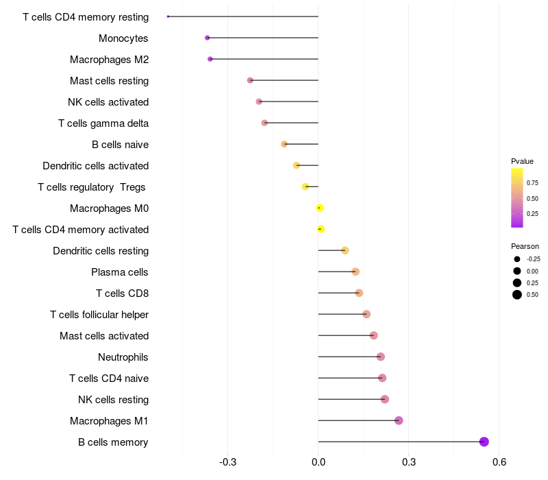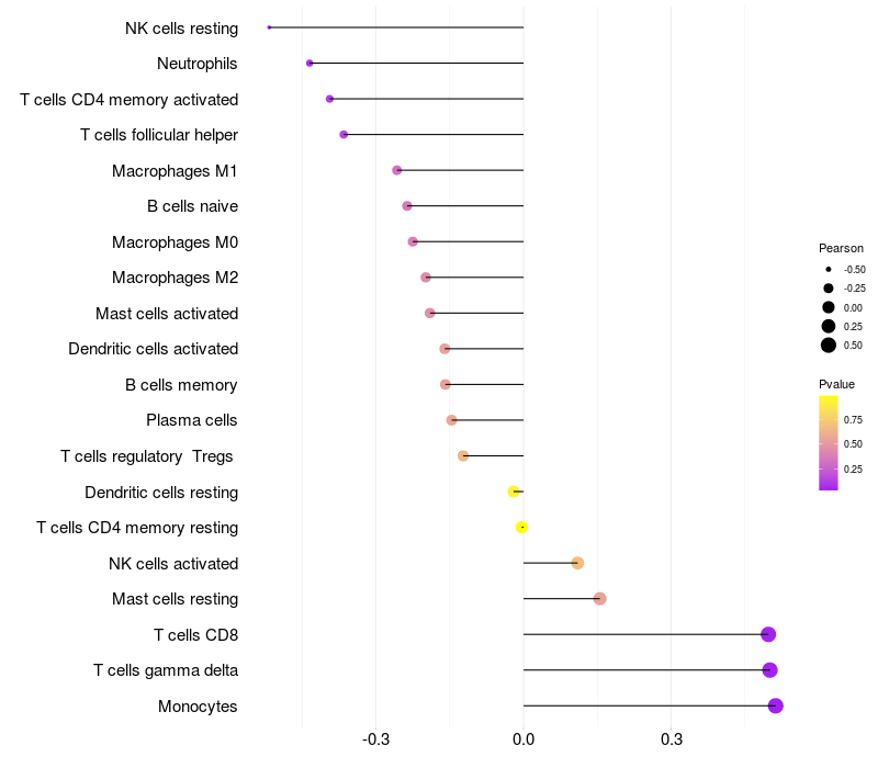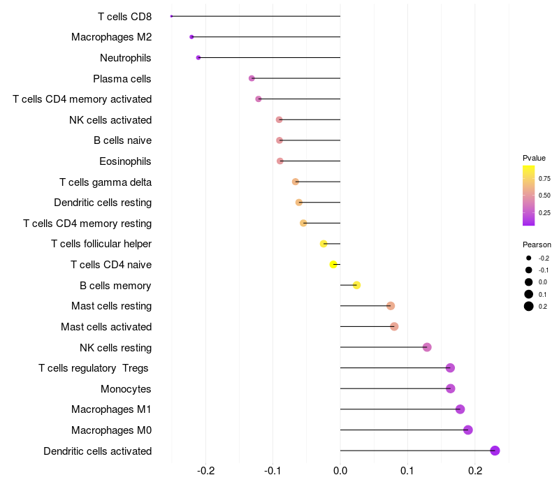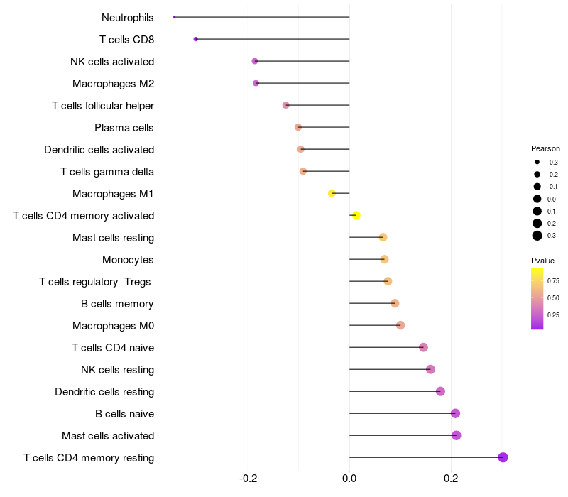 Lollipop of ZKSCAN2 expression and immune infiltrating cell level correlation result in HPV+ samples
