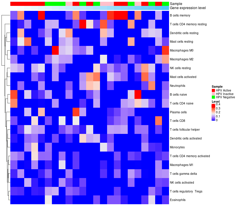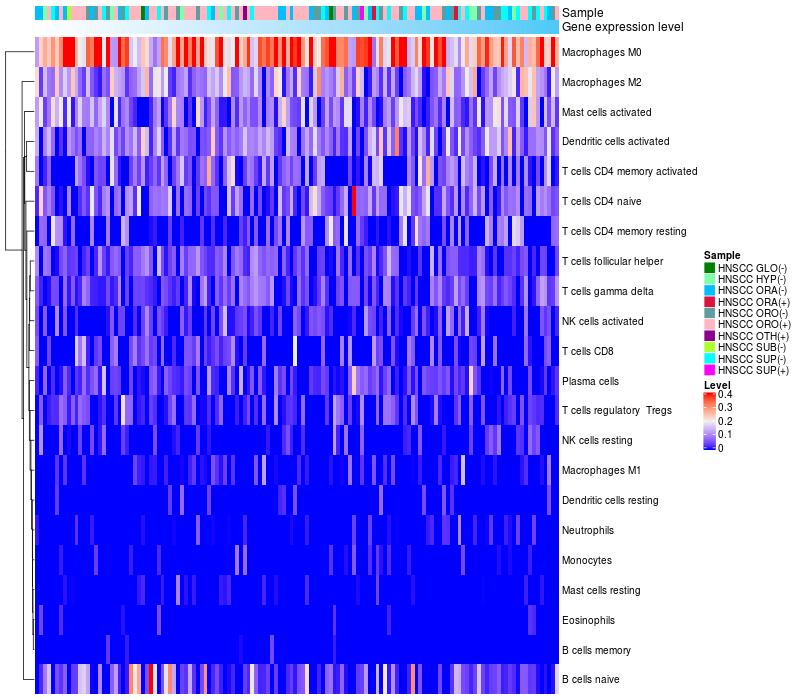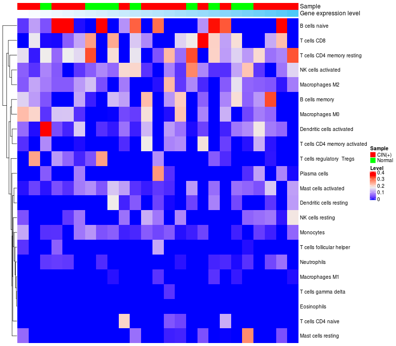 • Left: Heatmap of target gene expression and the level of various types of immune cells (cell type fractions) in all samples based on CIBERSORT method.