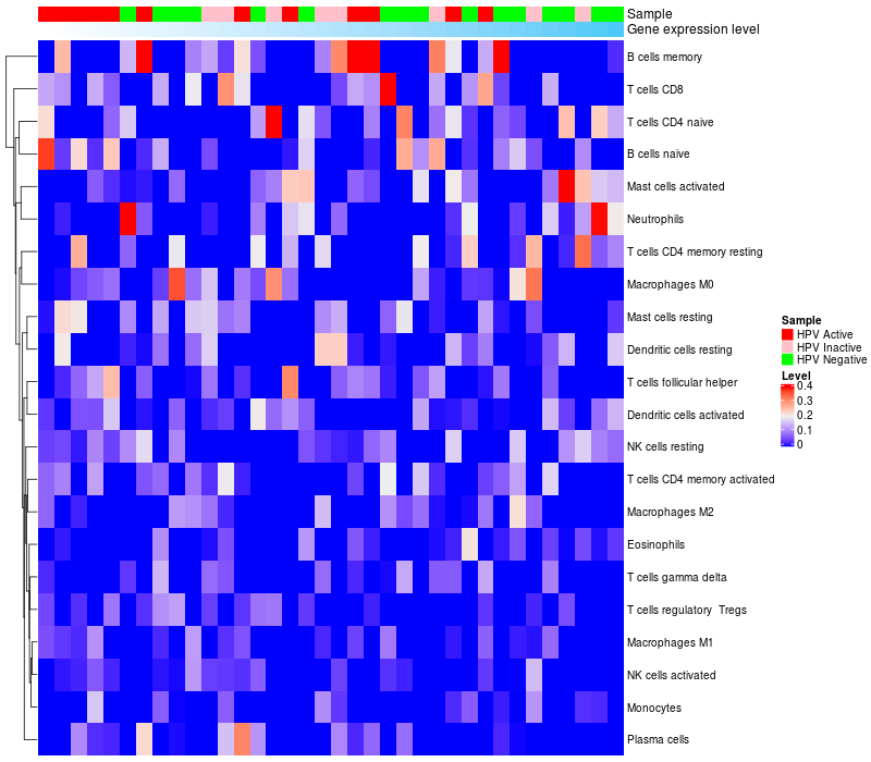 HeatMap of cell type fractions in all samples Lollipop of ZMYM5 expression and immune infiltrating cell level correlation result in HPV+ samples